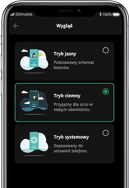 W GOmobile możesz ustalić wygląd dopasowany do twoich potrzeb, a tryb ciemny to jedna z dostępnych opcji. Domyślnie ustawioną opcją jest tryb systemowy.