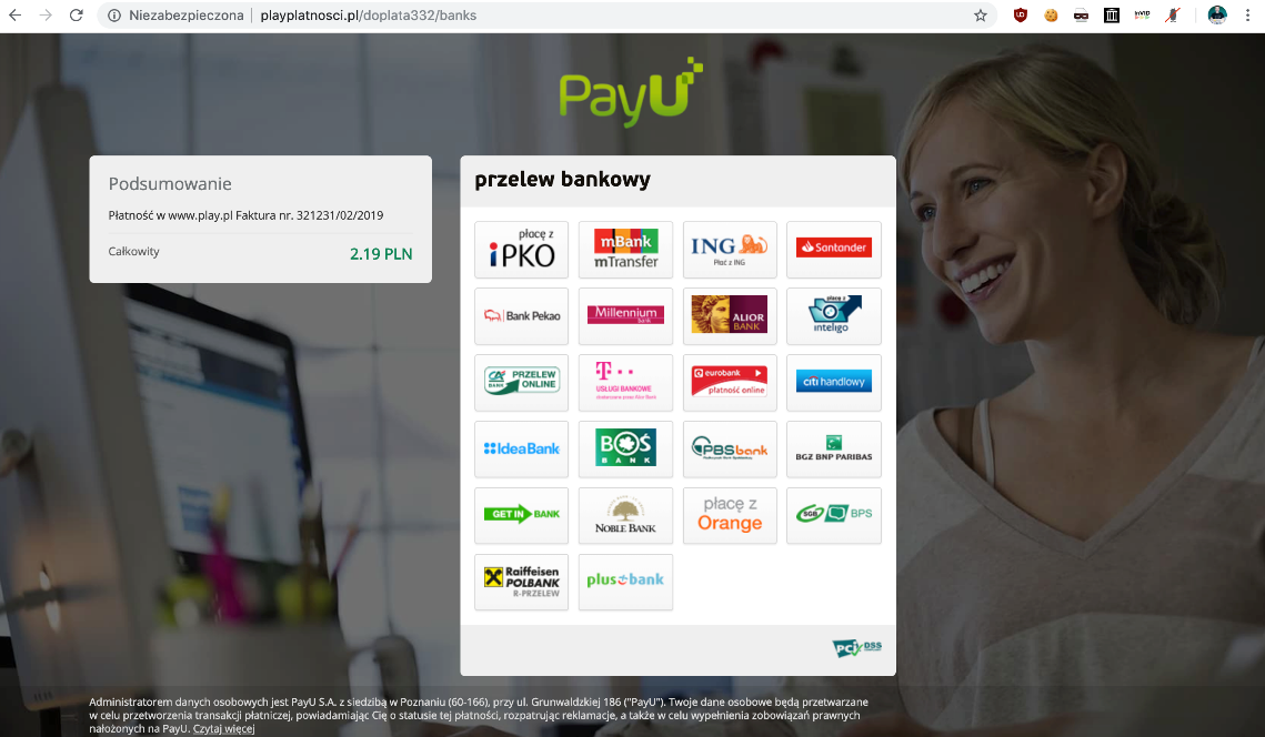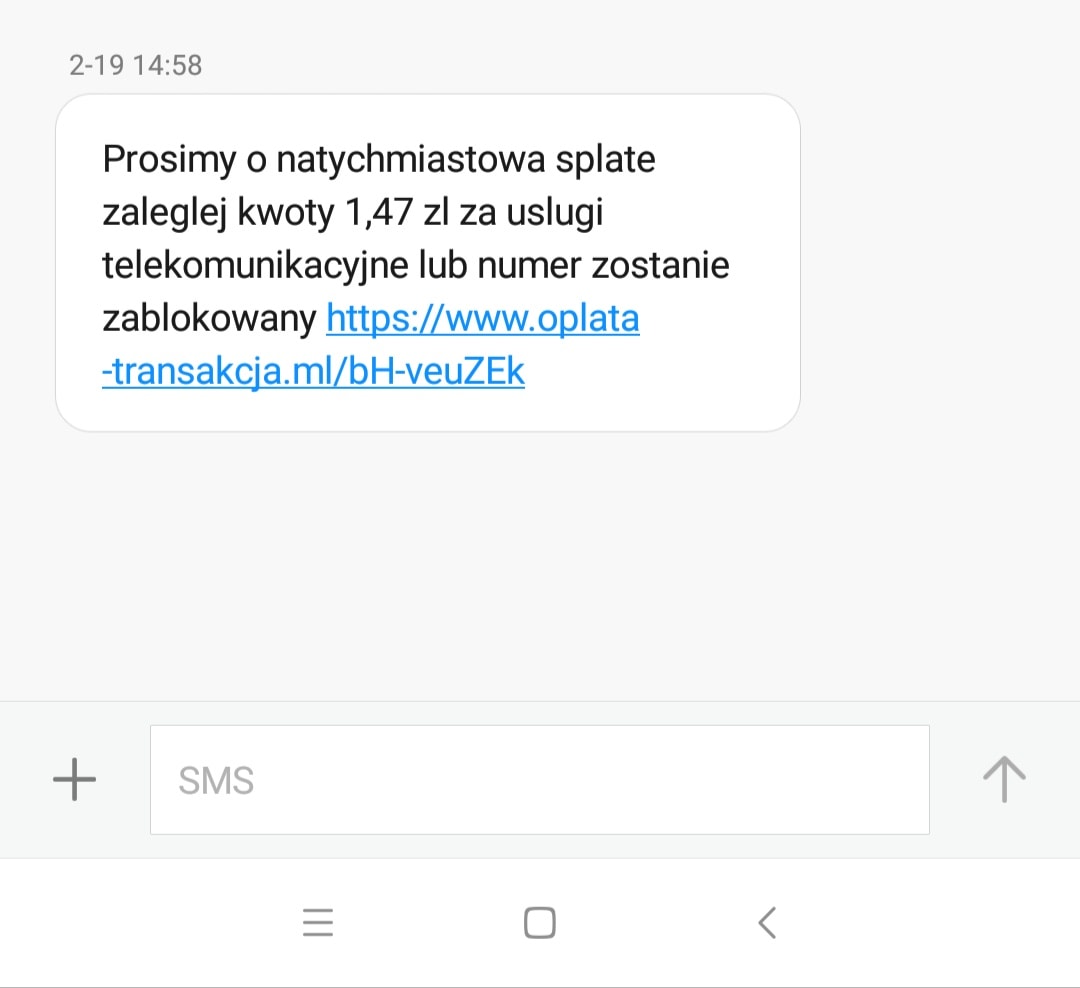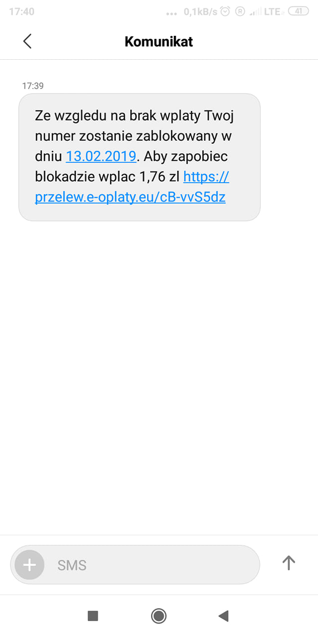 - Uważaj na wszystkie wiadomości o konieczności zapłaty lub dopłaty drobnych kwot (np. 0,76 PLN) zawierające link do strony udającej pośrednika płatności. Przed wykonaniem przelewu skontaktuj się z firmą, która figuruje jako nadawca wiadomości (np. operator telekomunikacyjny, sklep czy serwis internetowy).