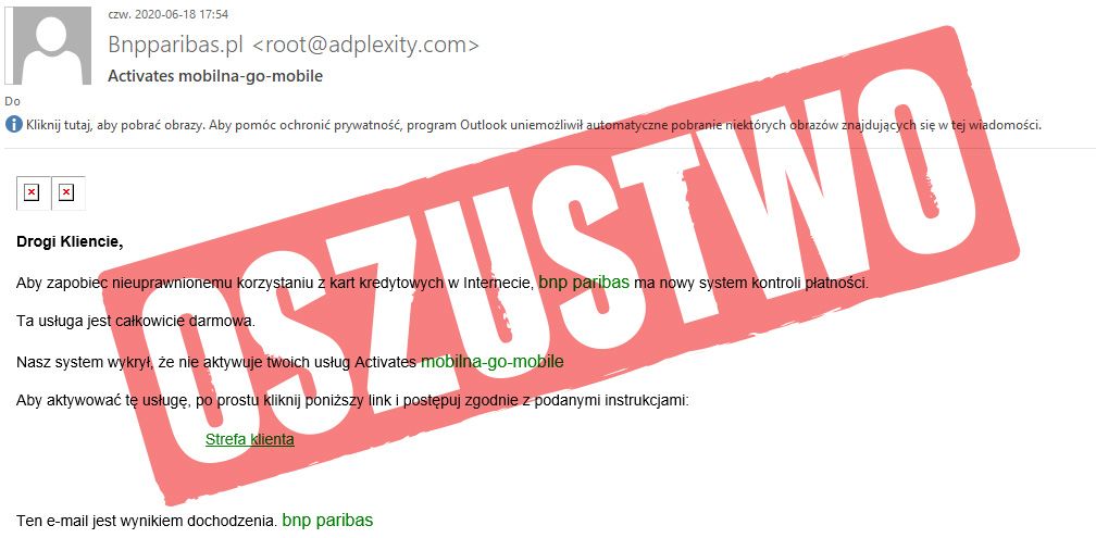 Przypominamy, że BNP Paribas nie posiada nowego systemu kontroli płatności, którego aktywowanie byłoby wymagane po stronie klienta, a poniższa wiadomość jest fałszywa i nie została wysłana przez Bank.
