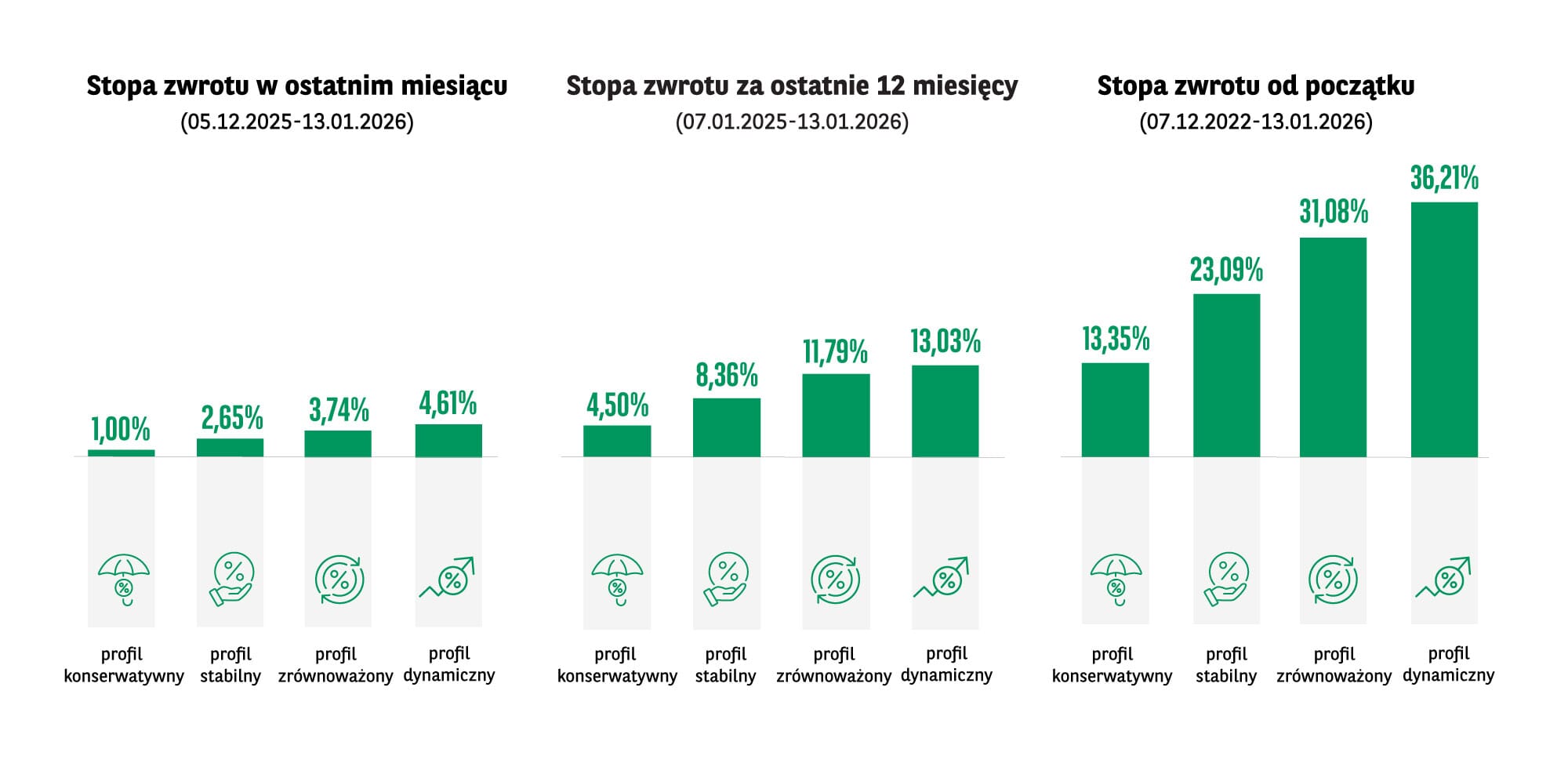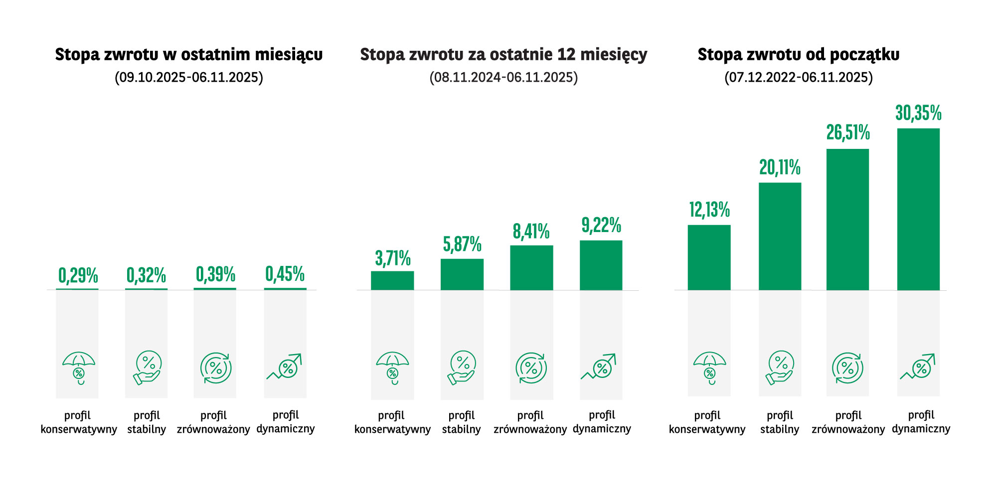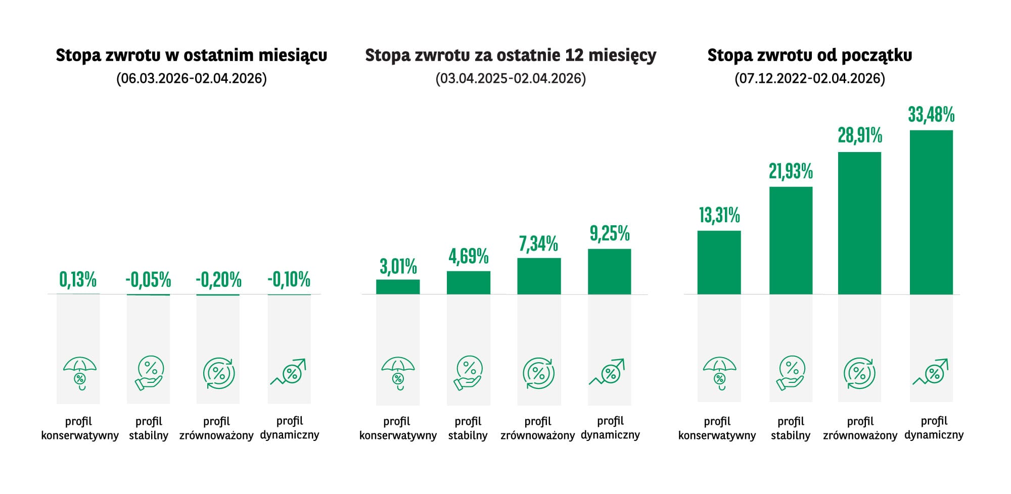 Prezentowane stopy zwrotu nie uwzględniają opłat, prowizji ani podatków obciążających dochód z inwestycji. Prezentowane dane przedstawiają stopy zwrotu poszczególnych portfeli modelowych, historycznymi odnoszą się do przeszłości. Wyniki w przeszłości nie stanowią pewnego wskaźnika na przyszłość.