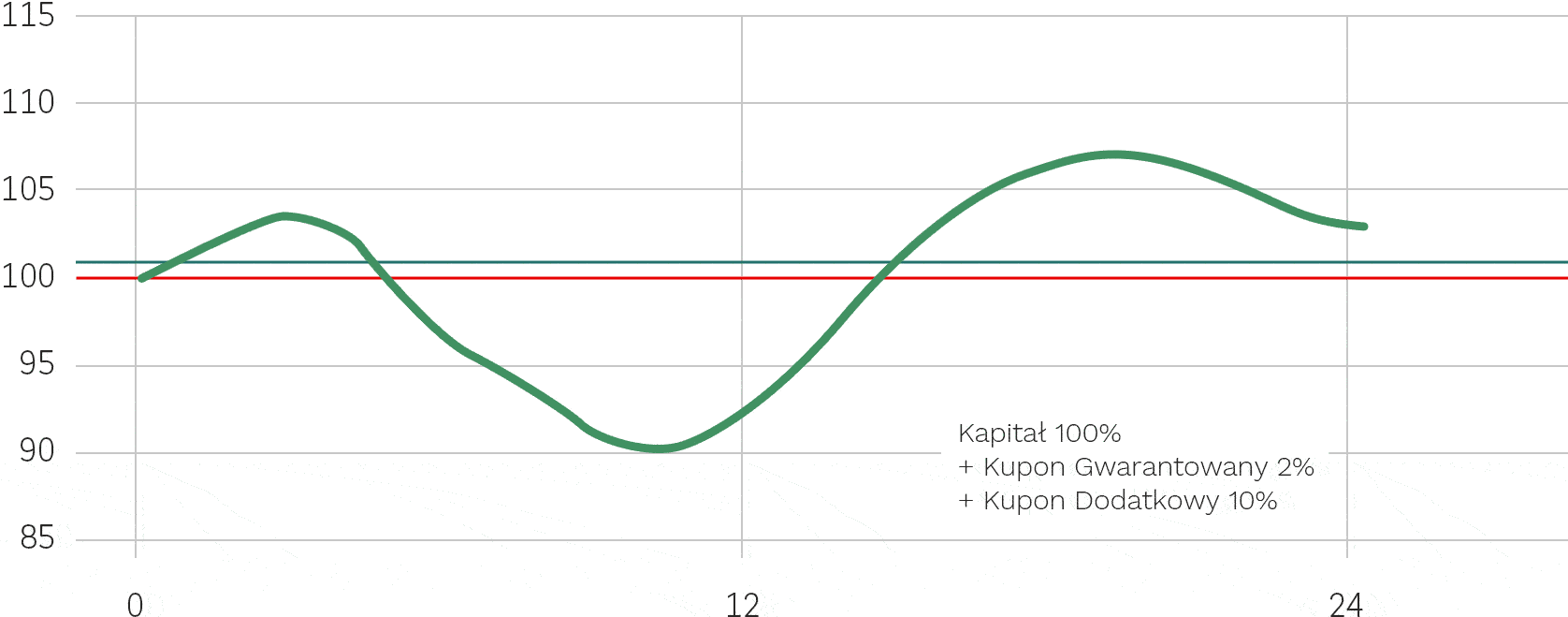 2) wzrośnie o 1% lub więcej względem Poziomu Początkowego, Inwestorom zostanie wypłacone 100% wartości nominalnej Certyfikatu, Gwarantowany Kupon 2% oraz Dodatkowy Kupon w wysokości 10% - w takiej sytuacji łączny zysk wyniesie 12% (6% w skali roku).