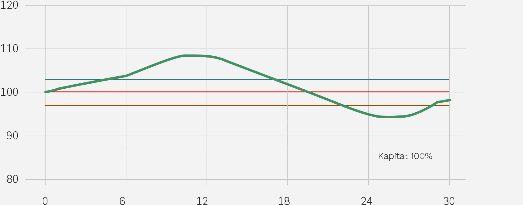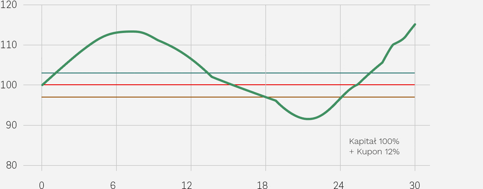 1) zmieni się względem Poziomu Początkowego o 3% lub mniej (będzie na lub poniżej Bariery Górnej albo na lub powyżej Bariery Dolnej) - Inwestorom zostanie wypłacone 100% wartości nominalnej Certyfikatu,