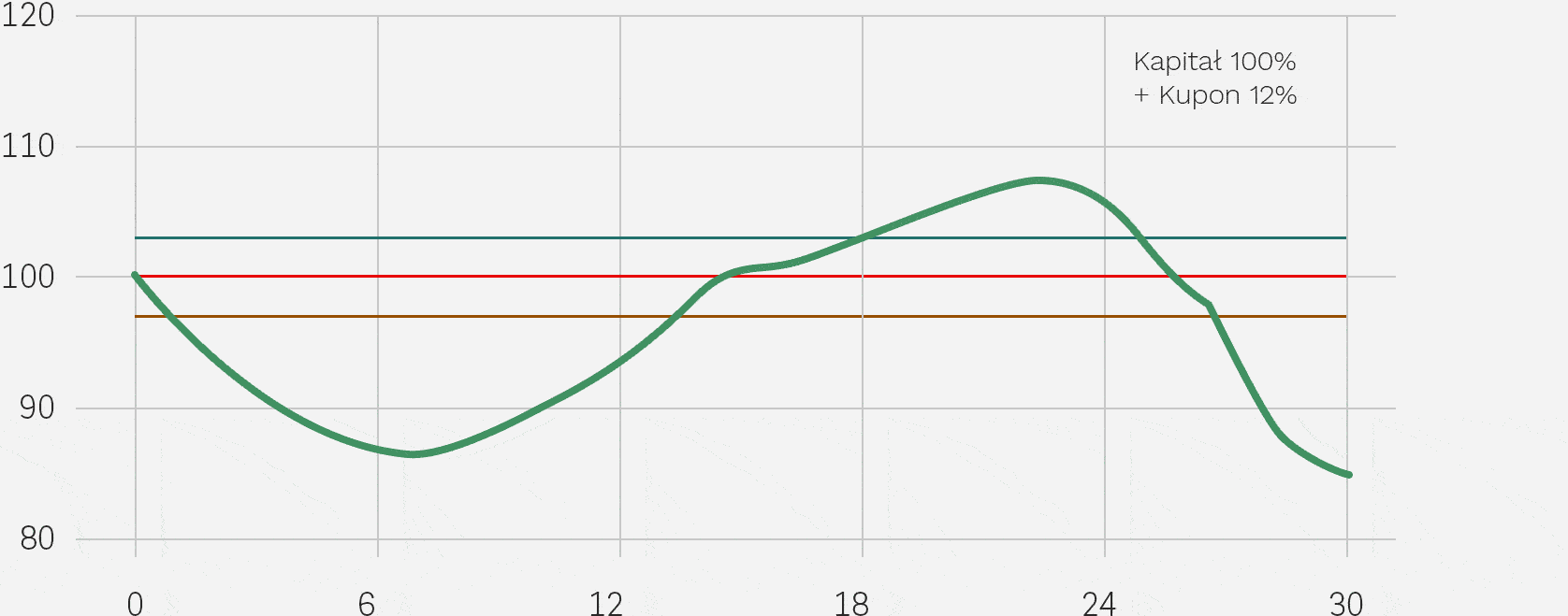 | Kupon | wartość procentowa równa zmianie notowań Indeksu (wzroście lub spadku) z Dnia Wyceny Wykupu względem Poziomu Początkowego, pomniejszona o 3% |