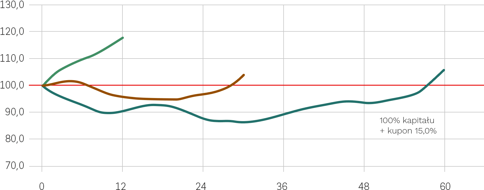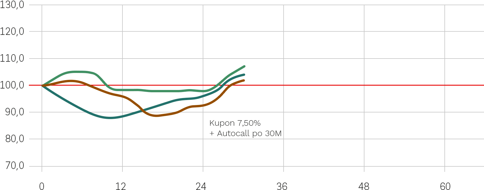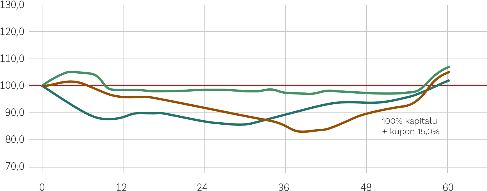 - każdej ze Spółek znajdą się na poziomie 100% Poziomu Początkowego lub powyżej tego poziomu w Dniu Wyceny Wykupu lub w dowolnym wcześniejszym Dniu Obserwacji – Inwestor otrzymuje Kupon w wysokości 1,5% za każde pół roku inwestycji (maksymalnie 15% w skali całej inwestycji);
