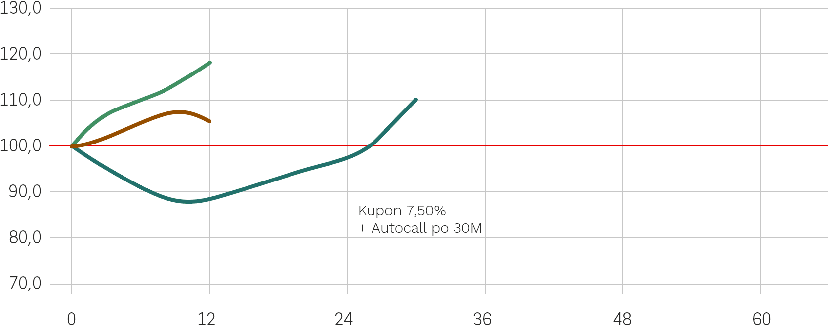 - przynajmniej jednej ze Spółek będzie poniżej 100% Poziomu Początkowego w każdym Dniu Obserwacji i w Dniu Wyceny Wykupu – Inwestor nie otrzymuje Kuponu.
