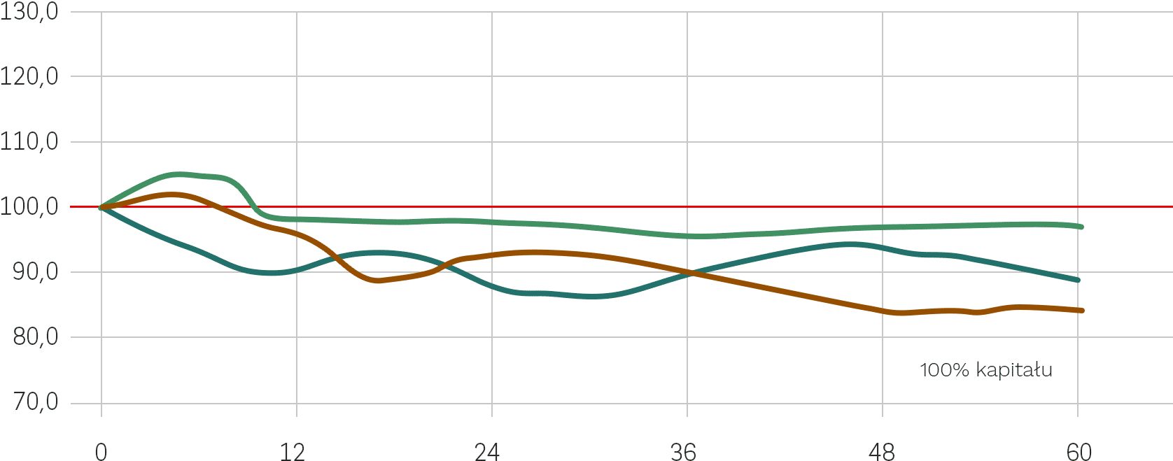 - nieotrzymanie Kuponu w przypadku, gdy w każdym z Dni Obserwacji oraz w Dniu Wyceny Wykupu notowanie akcji którejkolwiek ze Spółek będzie poniżej 100% Poziomu Początkowego
