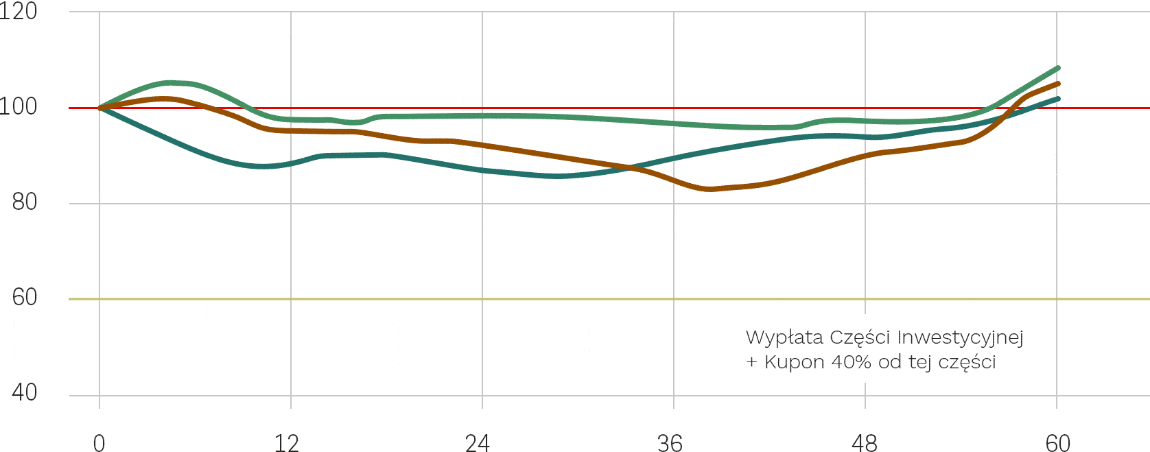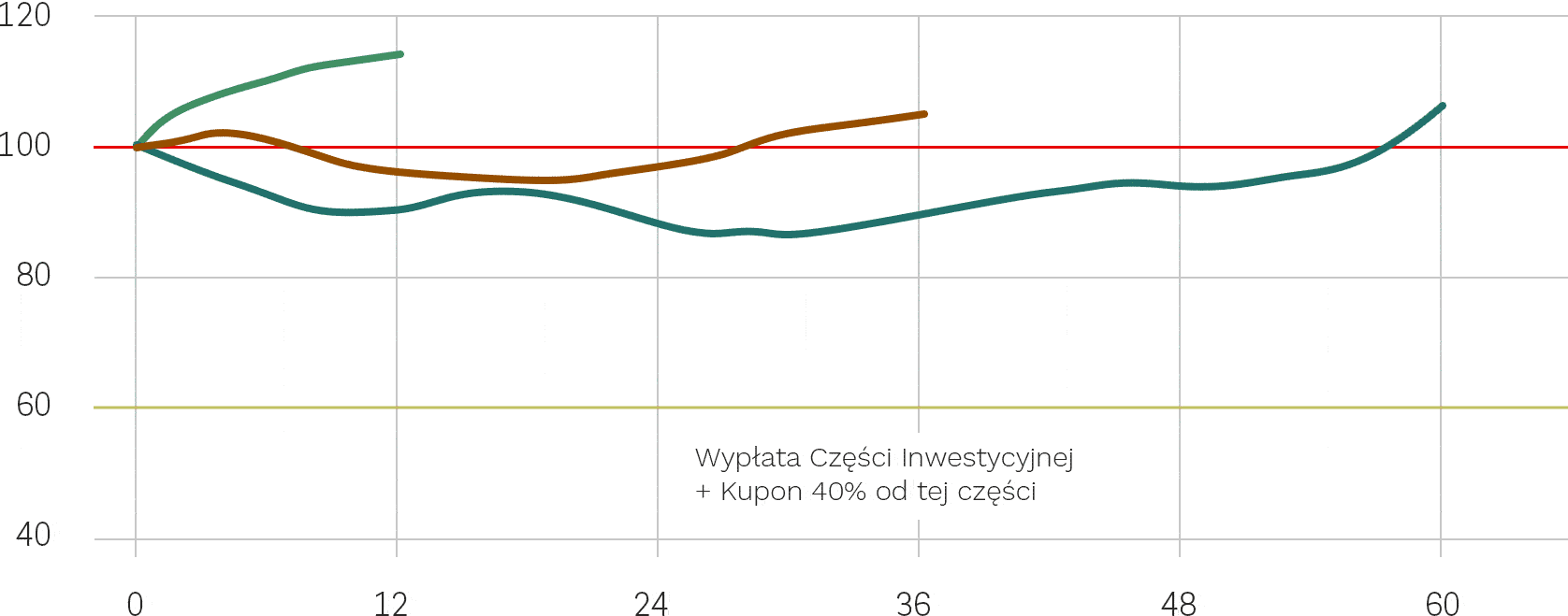 - każdej ze Spółek znajdą się na poziomie 100% Poziomu Początkowego albo powyżej tego poziomu w Dniu Wyceny Wykupu lub w dowolnym wcześniejszym Dniu Obserwacji – Inwestor otrzymuje zwrot Części Inwestycyjnej, a także Kupon w wysokości 40% od Części Inwestycyjnej (5 x 8%);