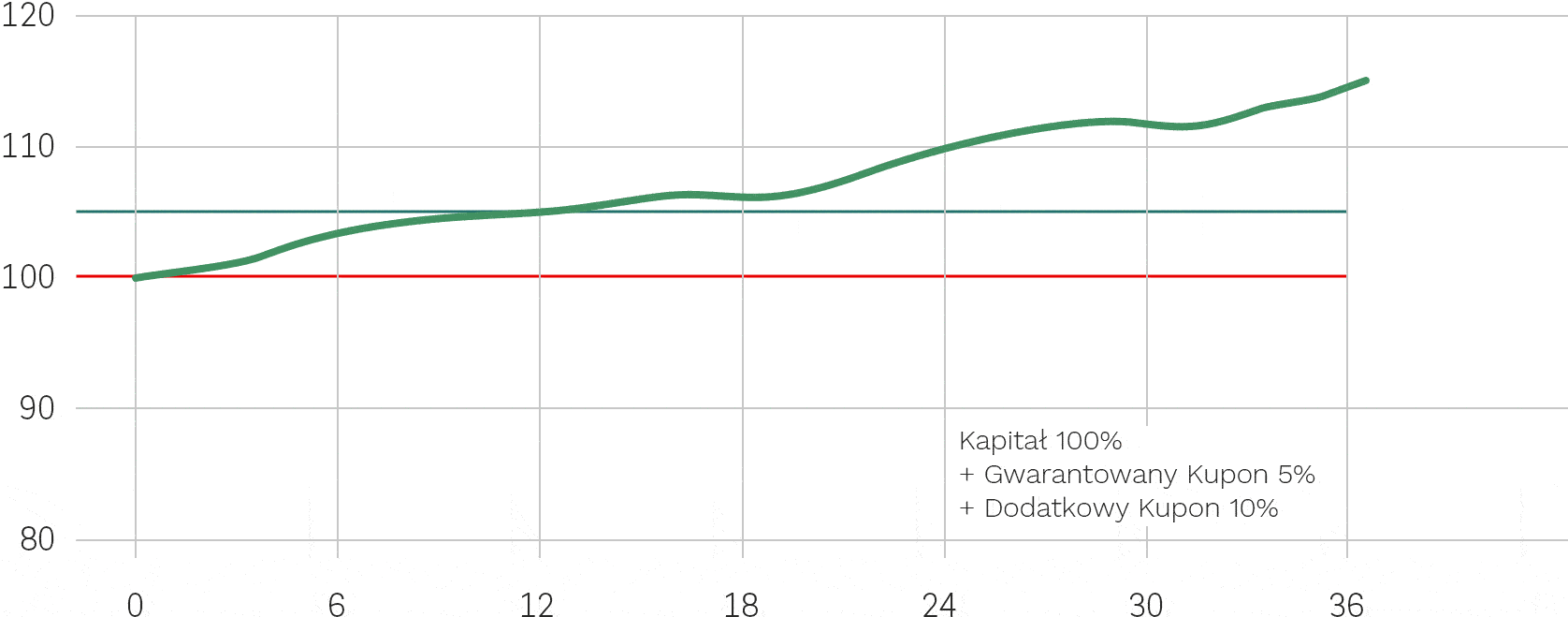 2) znajdzie się powyżej Bariery Wypłaty Dodatkowego Kuponu - Inwestorom zostanie wypłacone 100% wartości nominalnej Certyfikatu, Gwarantowany Kupon w wysokości 5% wartości nominalnej Certyfikatu oraz Dodatkowy Kupon w wysokości równej procentowemu wzrostowi wartości notowania Indeksu powyżej Bariery Wypłaty Dodatkowego Kuponu.-