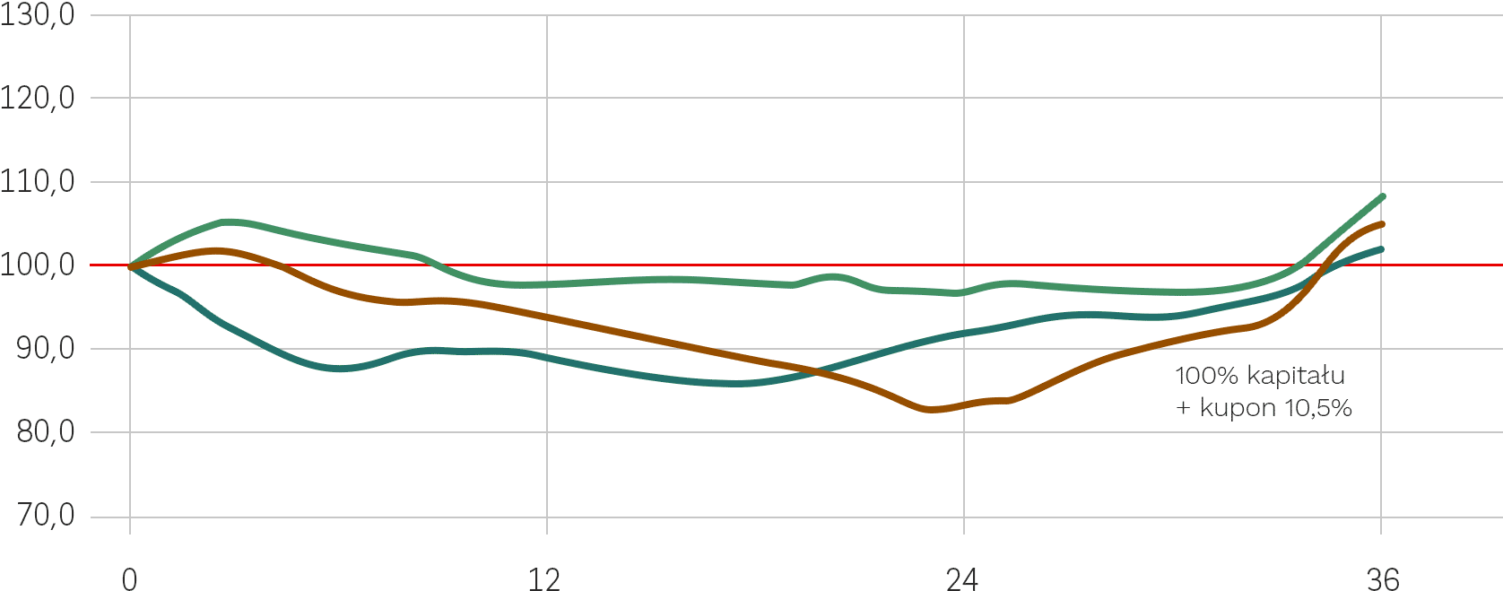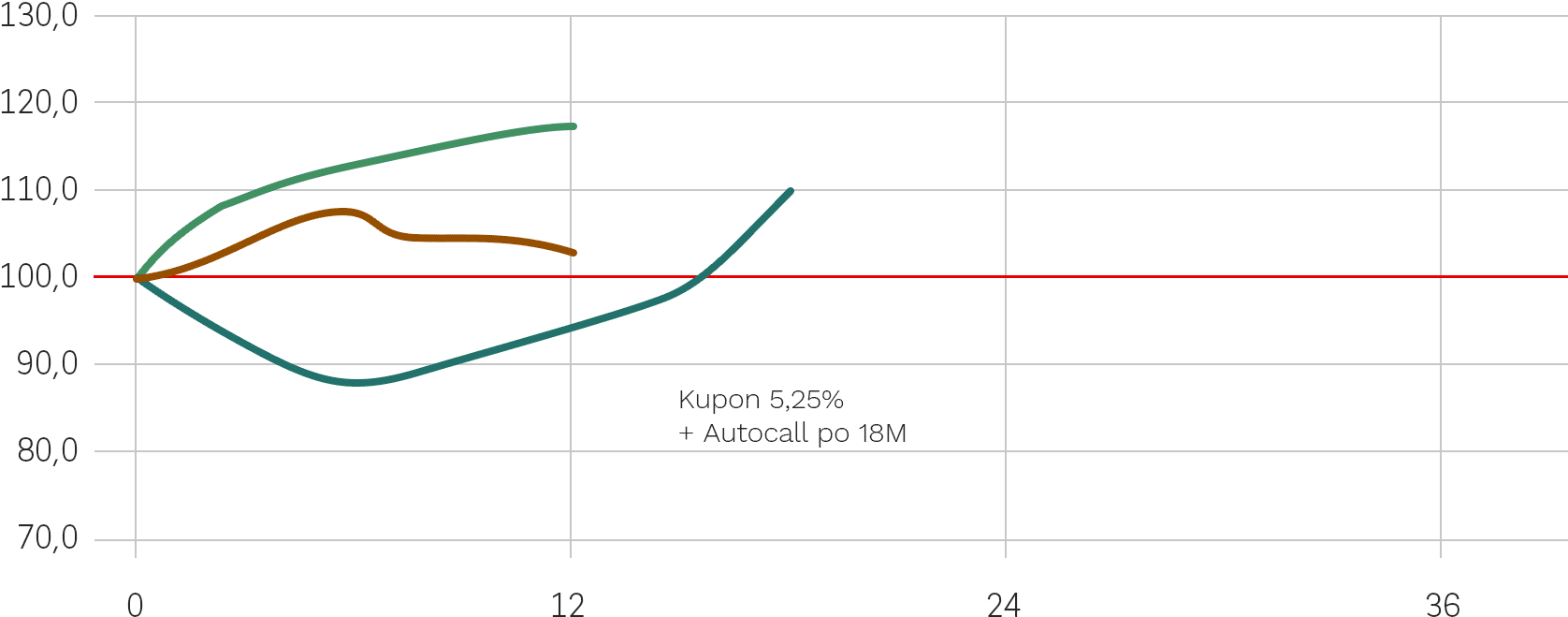 - każdej ze Spółek znajdą się na poziomie 100% Poziomu Początkowego lub powyżej tego poziomu w Dniu Wyceny Wykupu lub w dowolnym wcześniejszym Dniu Obserwacji – Inwestor otrzymuje Kupon w wysokości 1,75% za każde pół roku inwestycji (maksymalnie 10,5% w skali całej inwestycji);