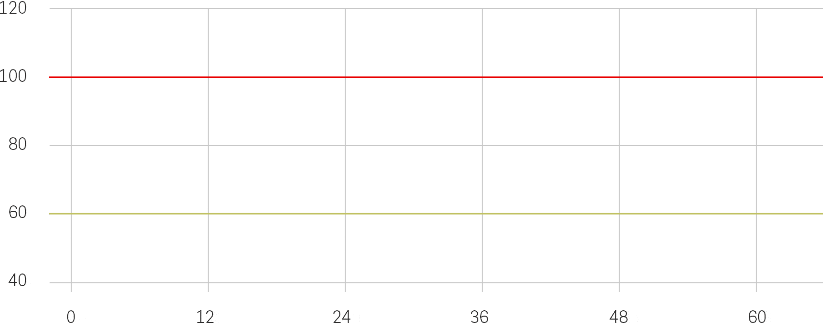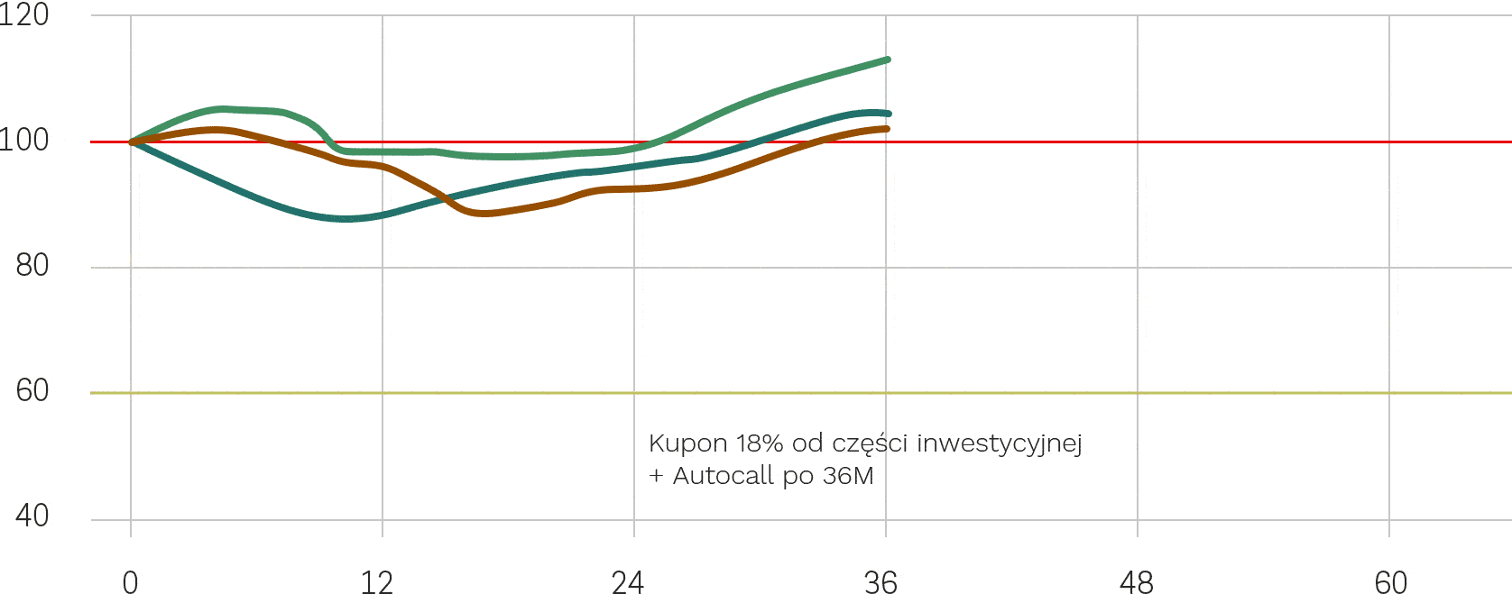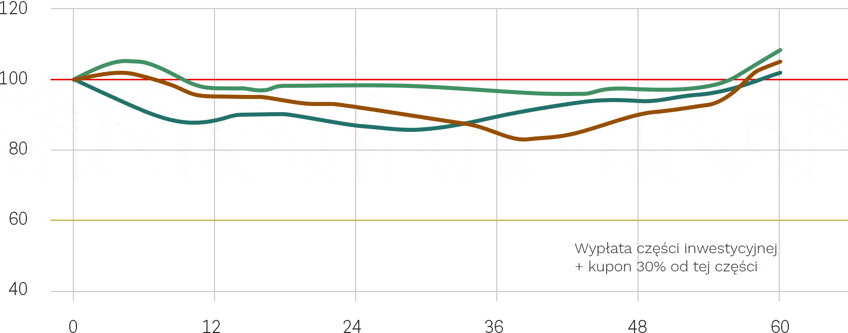- każdej ze Spółek znajdą się na poziomie 100% Poziomu Początkowego albo powyżej tego poziomu w Dniu Wyceny Wykupu lub w dowolnym wcześniejszym Dniu Obserwacji – Inwestor otrzymuje zwrot Części Inwestycyjnej, a także Kupon w wysokości 30% od Części Inwestycyjnej (5 x 6%);