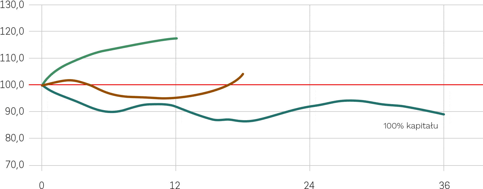 - każdej ze Spółek znajdą się na poziomie 100% Poziomu Początkowego lub powyżej tego poziomu w Dniu Wyceny Wykupu lub w dowolnym wcześniejszym Dniu Obserwacji – Inwestor otrzymuje Kupon w wysokości 3,5% za każde pół roku inwestycji (maksymalnie 21% w skali całej inwestycji);