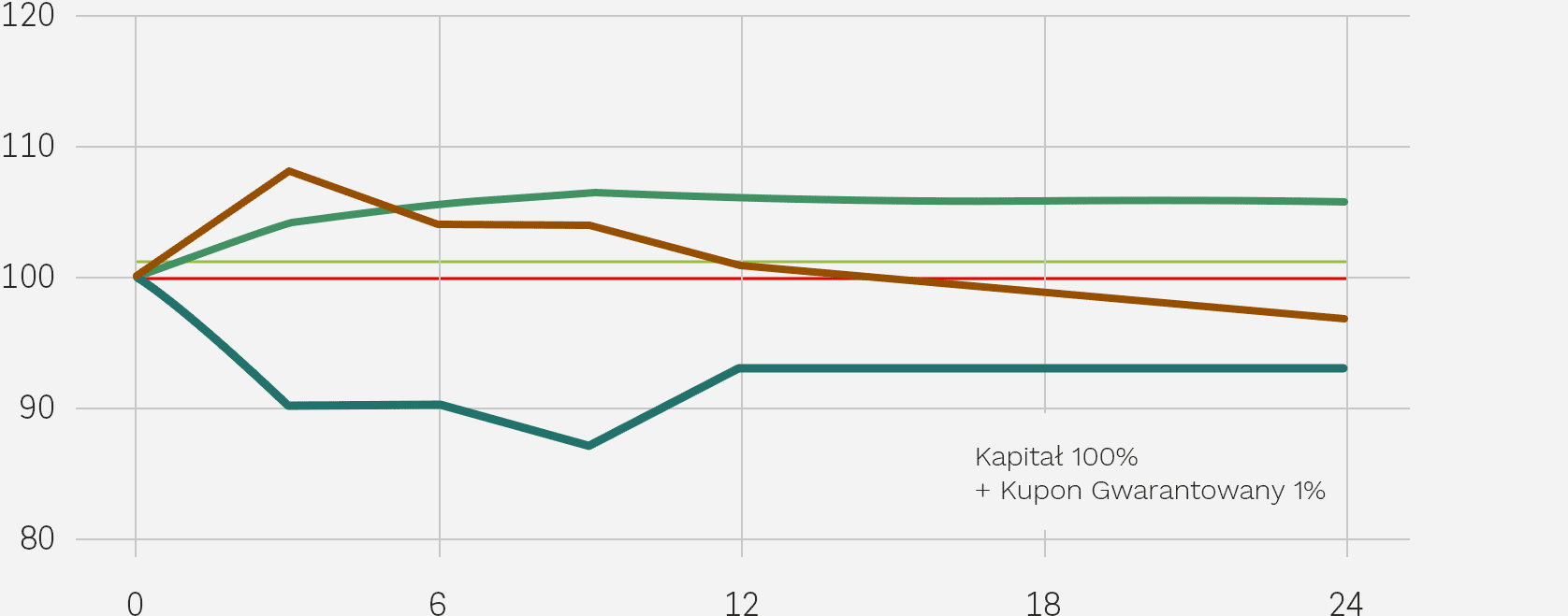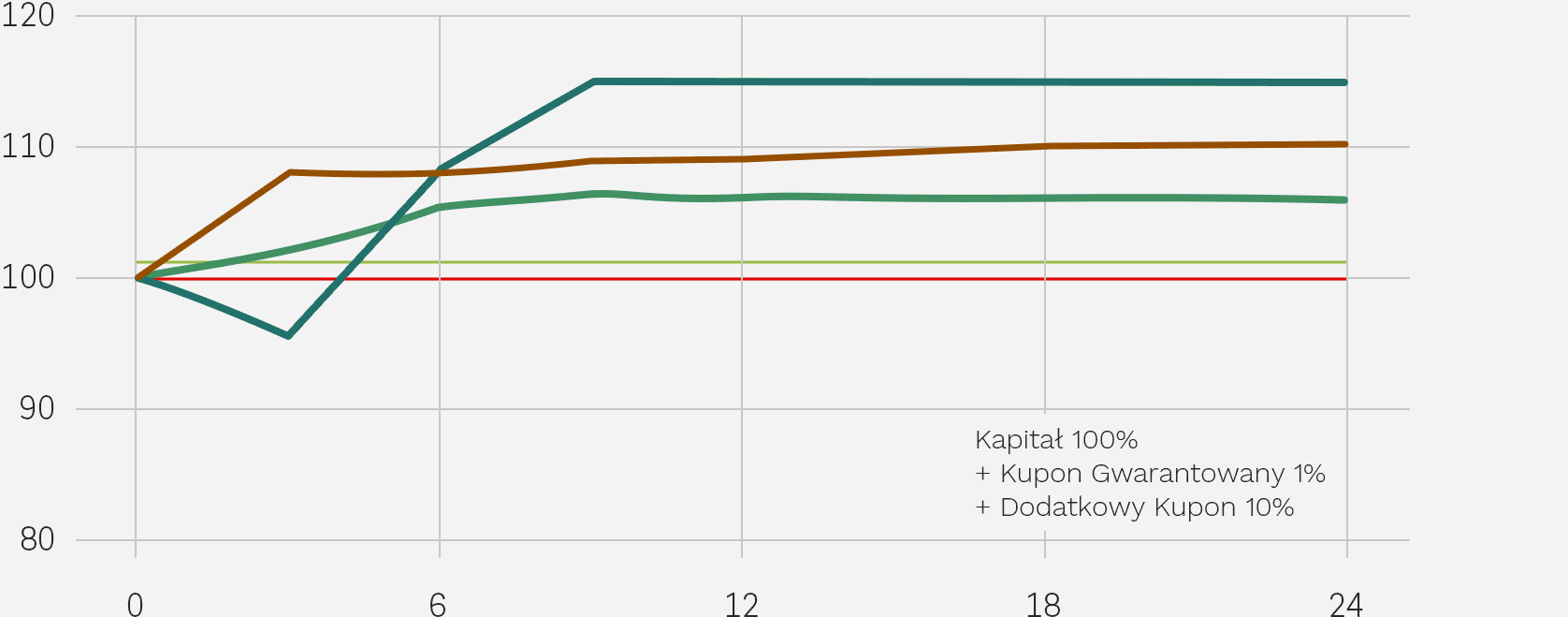 - przynajmniej jednej ze Spółek będzie poniżej Bariery Wypłaty Dodatkowego Kuponu (101% Poziomu Początkowego właściwego dla danej Spółki) – Inwestor nie otrzymuje Dodatkowego Kuponu.