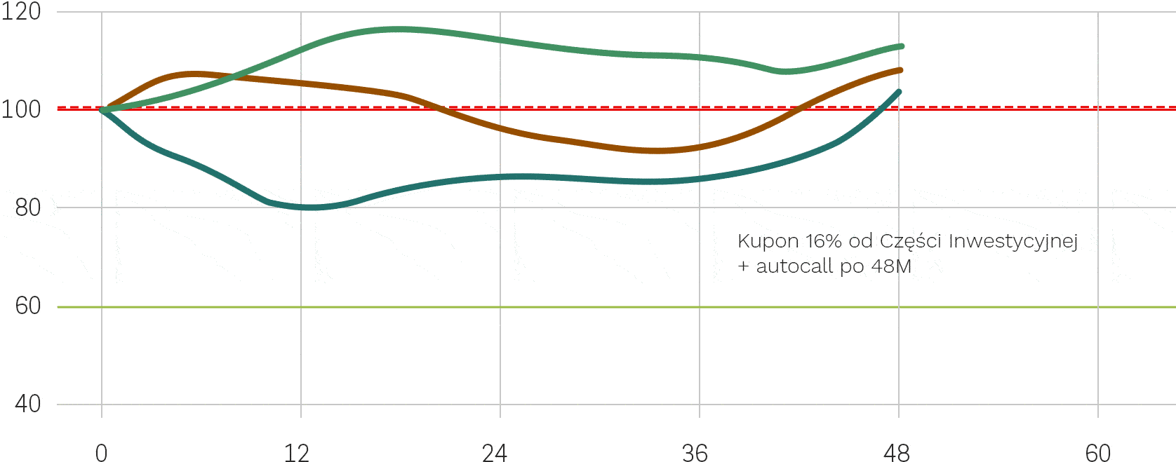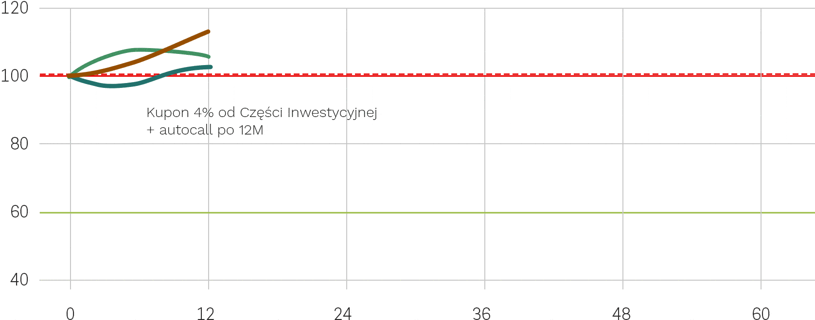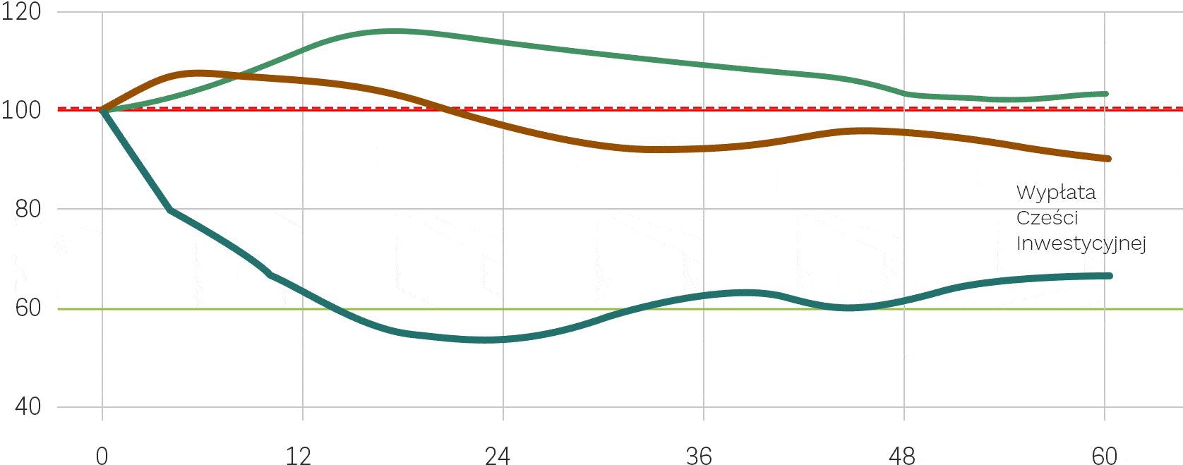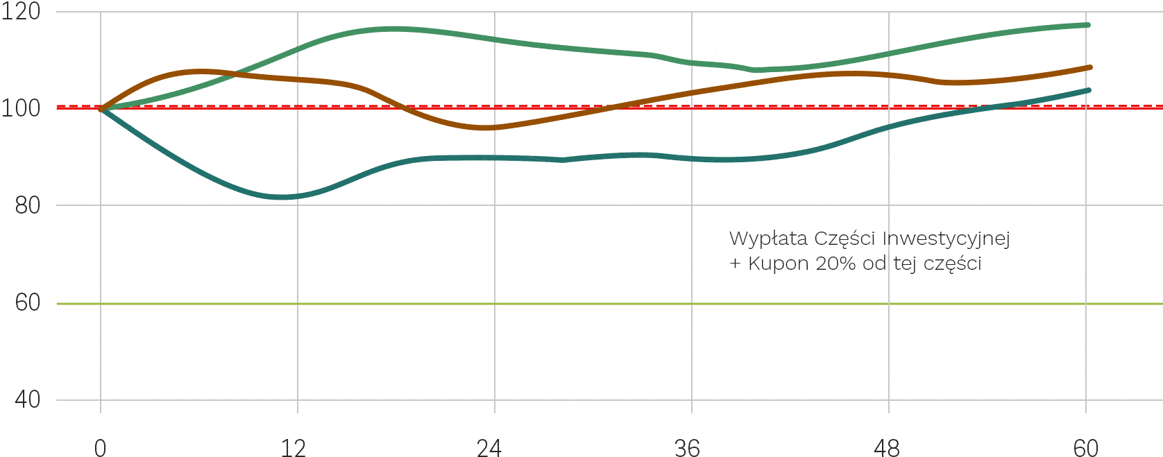- akcji wszystkich trzech Spółek osiągnie co najmniej 60% Poziomu Początkowego, ale przynajmniej jeden z nich będzie poniżej 100% tego Poziomu – inwestor otrzymuje zwrot Części Inwestycyjnej;