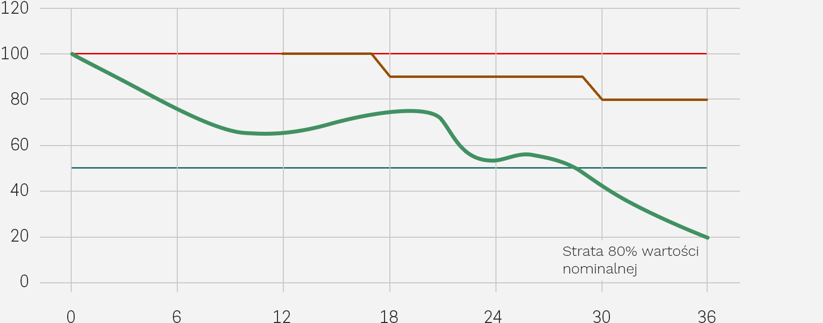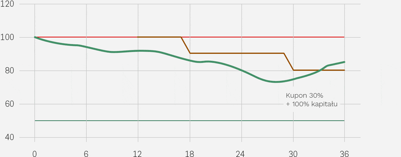 • osiągnie Poziom Warunkowej Ochrony Kapitału (50% Poziomu Początkowego), ale jednocześnie będzie poniżej Bariery Wypłaty Kuponu w Dniu Wykupu (80% Poziomu Początkowego), Inwestor otrzymuje zwrot 100% wartości nominalnej Certyfikatu;