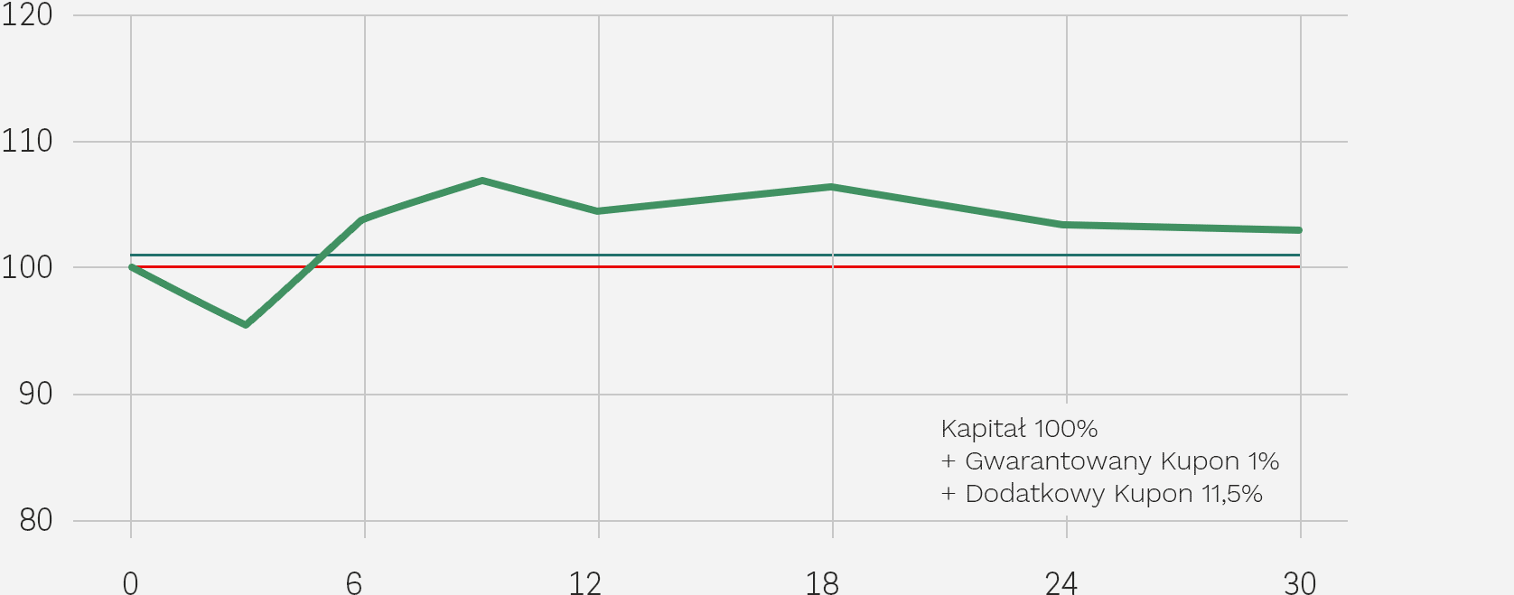 - znajdzie się poniżej Bariery Wypłaty Dodatkowego Kuponu (101% Poziomu Początkowego) – Inwestor nie otrzymuje Dodatkowego Kuponu.