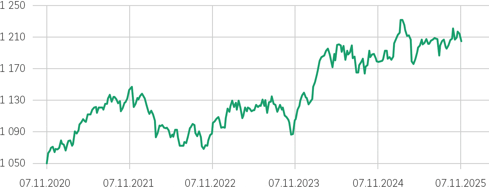 Datą rozpoczęcia notowań dla Indeksu jest dzień 28 października 2025 r. Wcześniejsze notowania przedstawione na wykresie nie stanowią rzeczywistych wyników, są one danymi hipotetycznymi przeliczonymi wstecz w oparciu o metodologię indeksu obowiązującą w dniu rozpoczęcia notowań. Więcej informacji na stronie internetowej notowania indeksu.