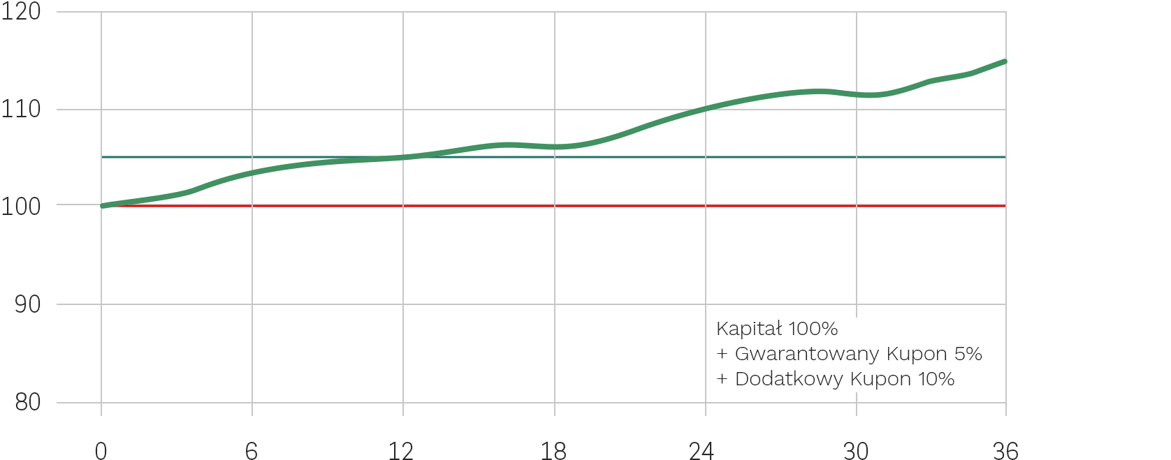 2) znajdzie się powyżej Bariery Wypłaty Dodatkowego Kuponu - Inwestorom zostanie wypłacone 100% wartości nominalnej Certyfikatu, Gwarantowany Kupon w wysokości 5% wartości nominalnej Certyfikatu oraz Dodatkowy Kupon w wysokości równej procentowemu wzrostowi wartości notowania Indeksu powyżej Bariery Wypłaty Dodatkowego Kuponu.