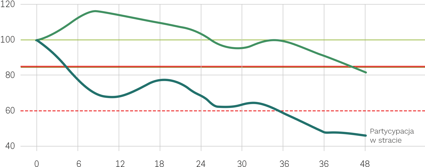 - warunkową ochronę kapitału, jeśli spadek notowań Funduszu nie przekroczy 40% (szczegółowe zasady są przedstawione poniżej),