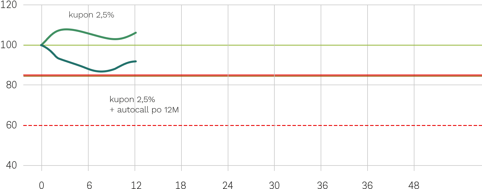 W przeciwnym razie, czyli jeśli w danym Dniu Obserwacji, wartość notowań któregokolwiek z Funduszy będzie niższa od Poziomu Bariery Automatycznego Wcześniejszego Wykupu oraz Bariery Wypłaty Kuponu, inwestycja trwa dalej. Kupon w tej obserwacji nie jest wypłacany, przy czym jeżeli w którejkolwiek z następnych obserwacji spełniony zostanie warunek wypłaty Kuponu, to będzie on wypłacony za wszystkie te okresy, w których nie był wcześniej wypłacony (efekt „śnieżnej kuli”). W celu uniknięcia wątpliwości należy pamiętać, że po automatycznym przedterminowym wykupieniu Certyfikatów żaden kolejny Kupon nie zostanie już wypłacony.