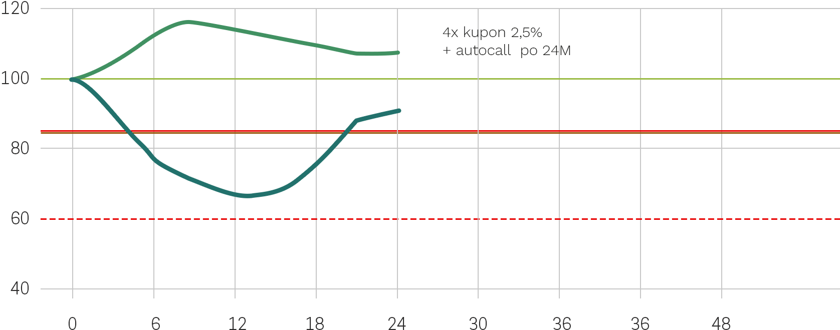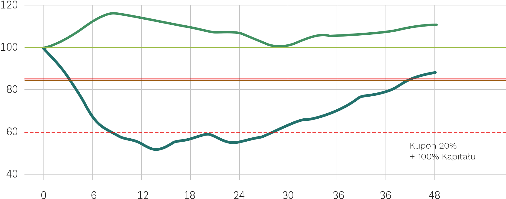 - obu Funduszy osiągnie co najmniej 85% Poziomu Początkowego – Inwestor otrzymuje zwrot wartości nominalnej, a także Kupon w wysokości 20% (8 x 2,5%);