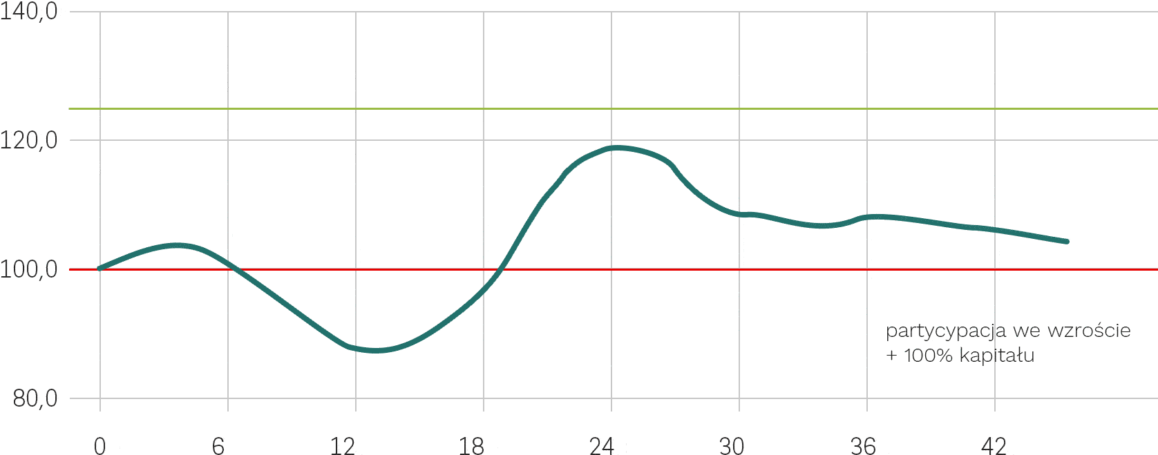 | Zysk | Inwestor ma udział/partycypuje w 100% we wzroście Indeksu z zastrzeżeniem, że Zysk ograniczony jest do 25% |