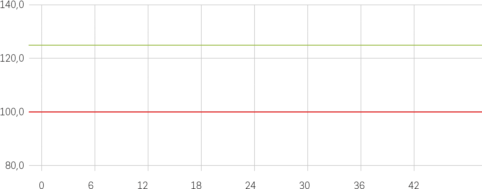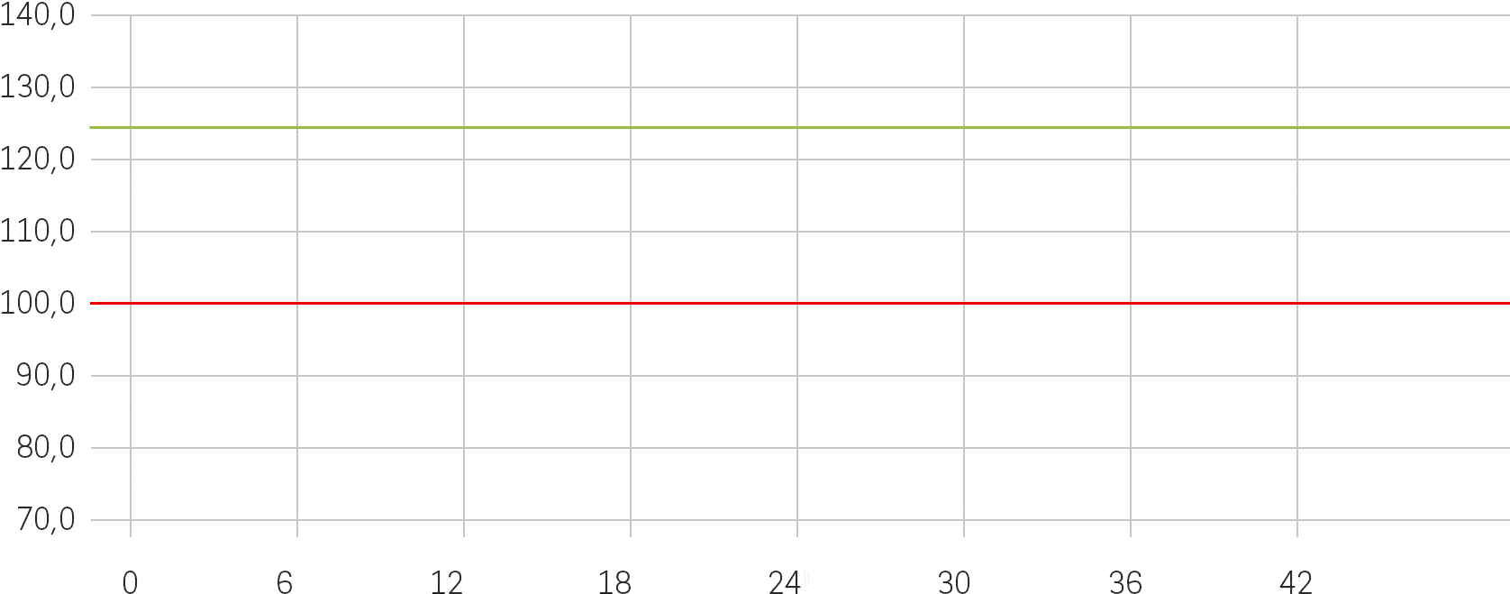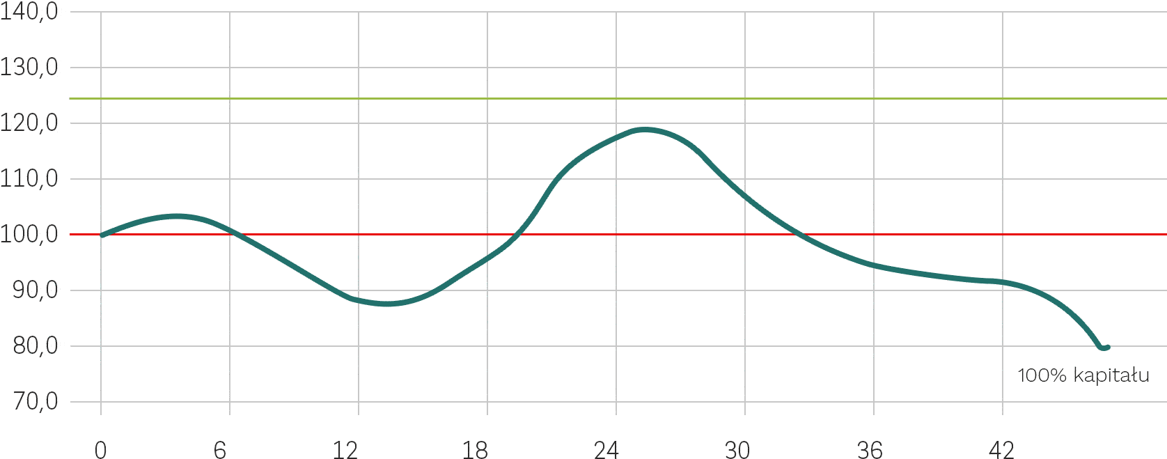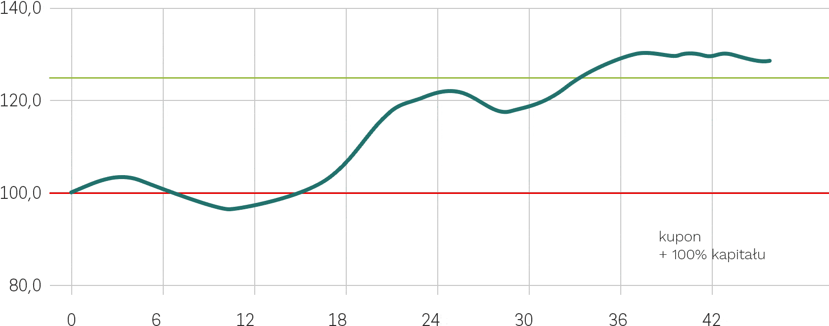 na lub powyżej 125% wartości Poziomu Początkowego – Inwestorom zostanie wypłacone 100% wartości nominalnej Certyfikatu oraz Zysk w wysokości 25% (7,14% w skali roku);