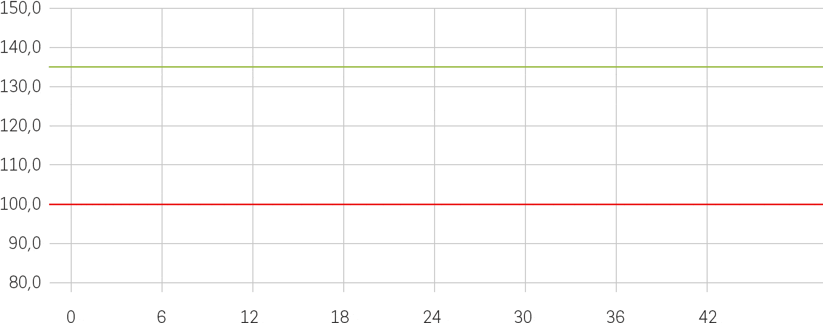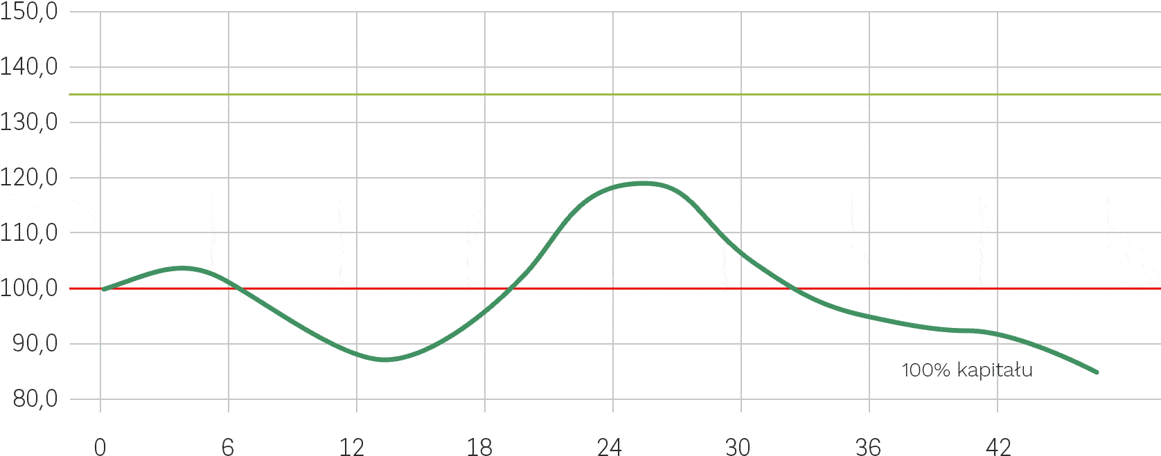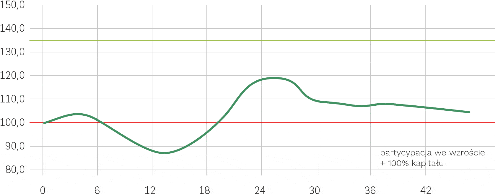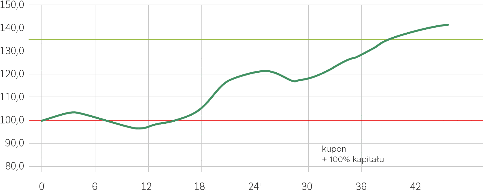 na lub powyżej 135% wartości Poziomu Początkowego – Inwestorom zostanie wypłacone 100% wartości nominalnej Certyfikatu oraz Zysk w wysokości 35% (10% w skali roku);