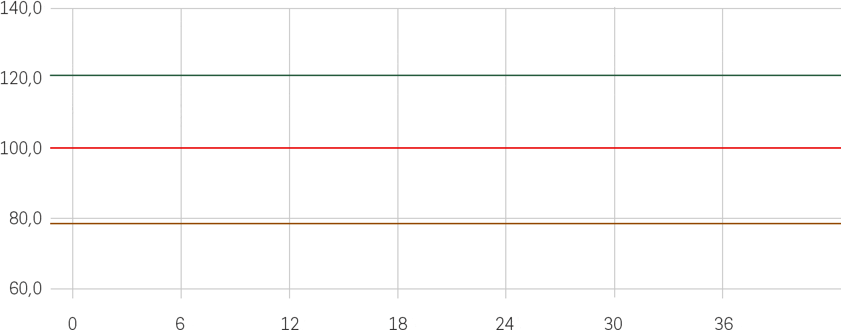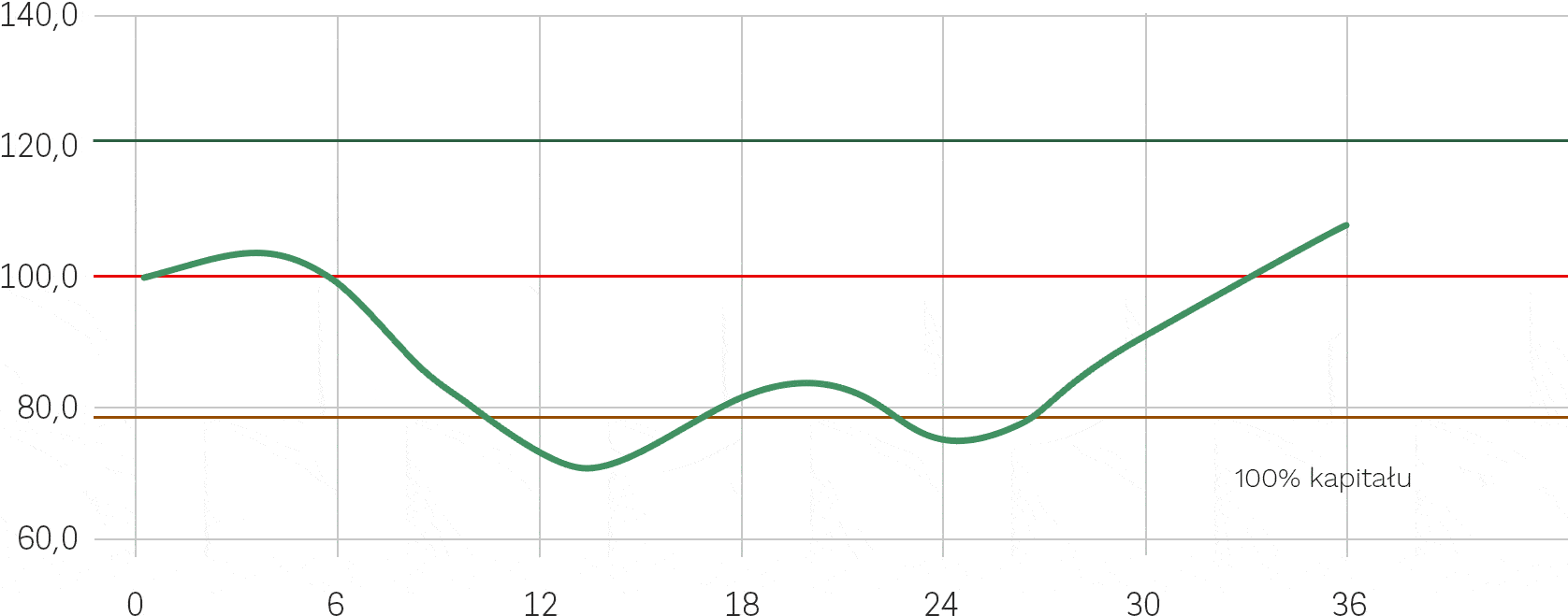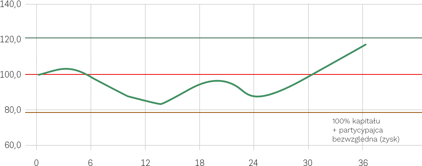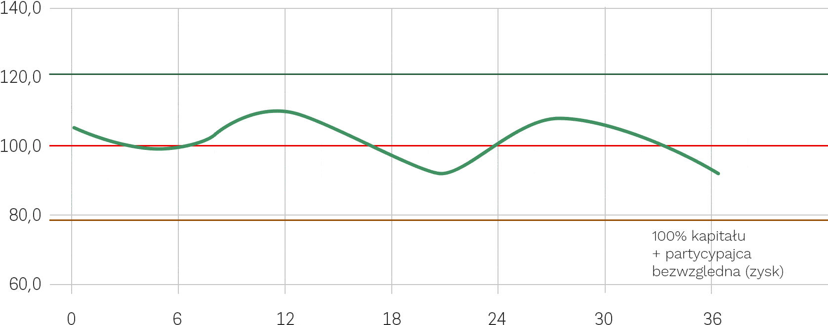 nigdy nie przekroczy Bariery Dolnej, ani Bariery Górnej (tj. nie będzie poniżej 79% wartości Poziomu Początkowego, albo powyżej 121% wartości Poziomu Początkowego) – Inwestorom w Dniu Wykupu zostanie wypłacone 100% wartości nominalnej Certyfikatu, powiększone o Zysk liczony jako różnica pomiędzy Poziomem Zamknięcia a Poziomem Początkowym (Inwestor ma udział/partycypuje w 100% w zmianie (wzroście lub spadku) notowania Indeksu).