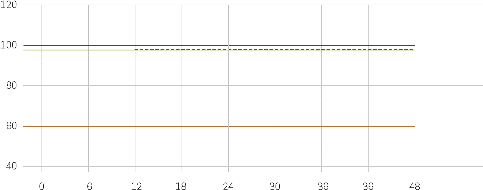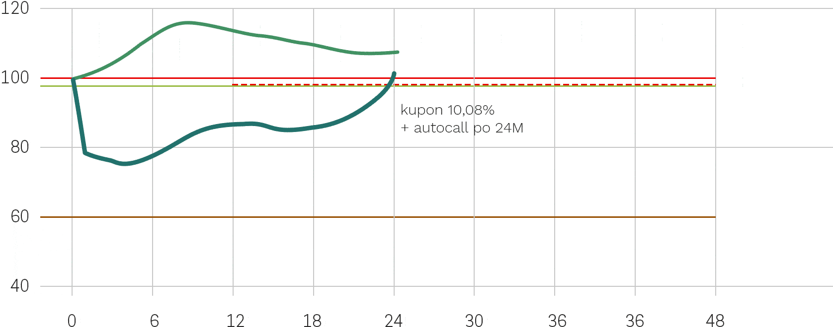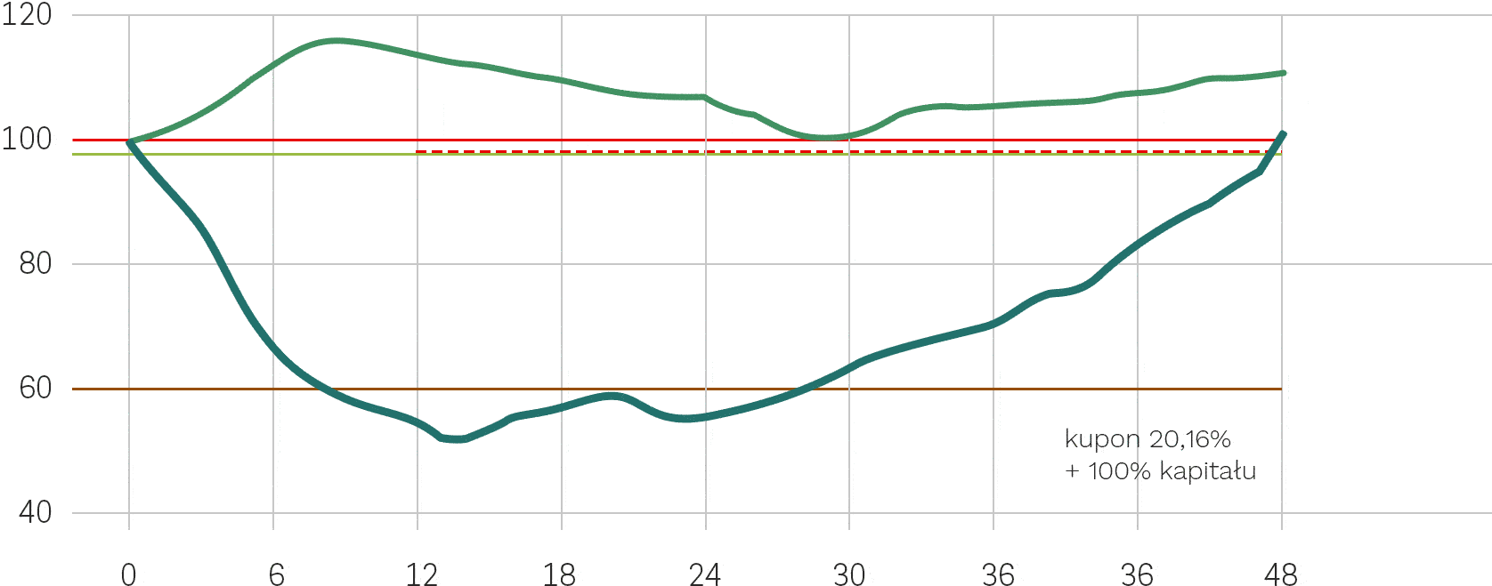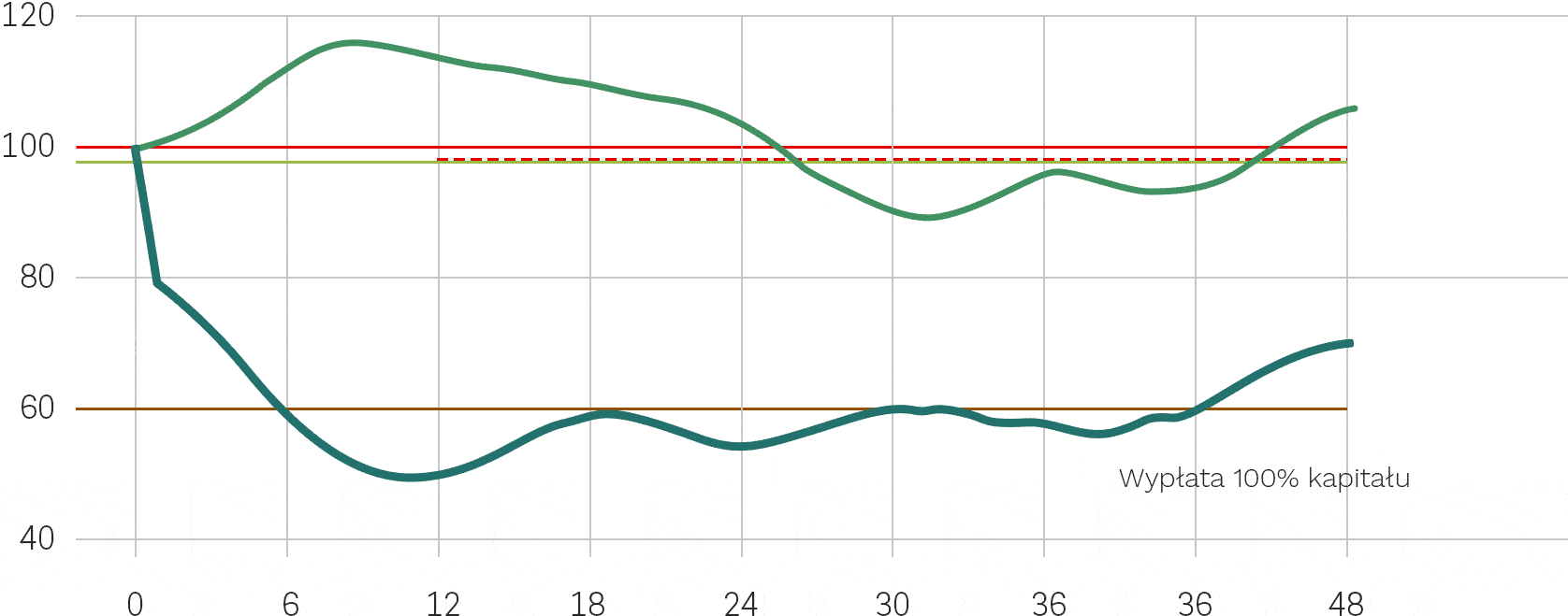 - obu Funduszy osiągnie co najmniej 98% Poziomu Początkowego – Inwestor otrzymuje zwrot wartości nominalnej, a także Kupon w wysokości 20,16% (48 x 0,42%);