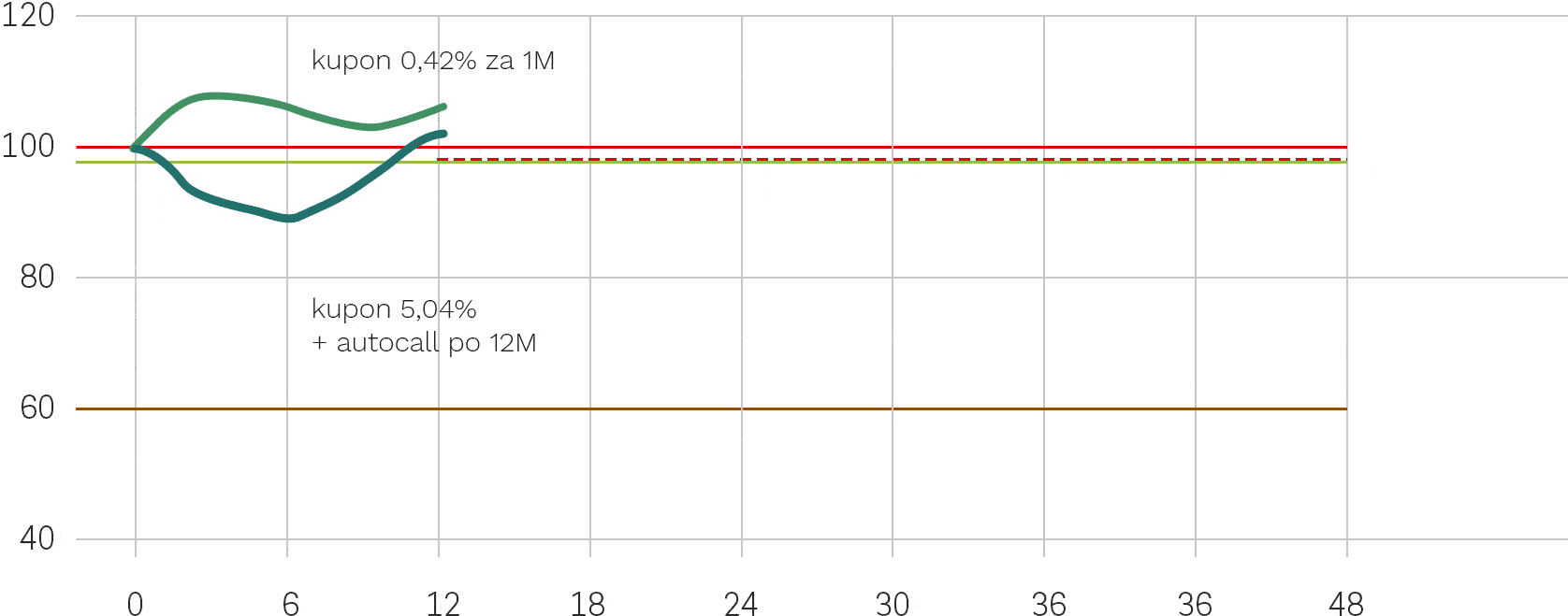 W przeciwnym razie, czyli jeśli w danym Dniu Obserwacji, wartość notowań któregokolwiek z Funduszy będzie niższa od Poziomu Bariery Automatycznego Wcześniejszego Wykupu oraz Bariery Wypłaty Kuponu, inwestycja trwa dalej. Kupon w tej obserwacji nie jest wypłacany, przy czym jeżeli w którejkolwiek z następnych obserwacji spełniony zostanie warunek wypłaty Kuponu, to będzie on wypłacony za wszystkie te okresy, w których nie był wcześniej wypłacony (efekt „śnieżnej kuli”). W celu uniknięcia wątpliwości należy pamiętać, że po automatycznym przedterminowym wykupieniu Certyfikatów żaden kolejny Kupon nie zostanie już wypłacony.