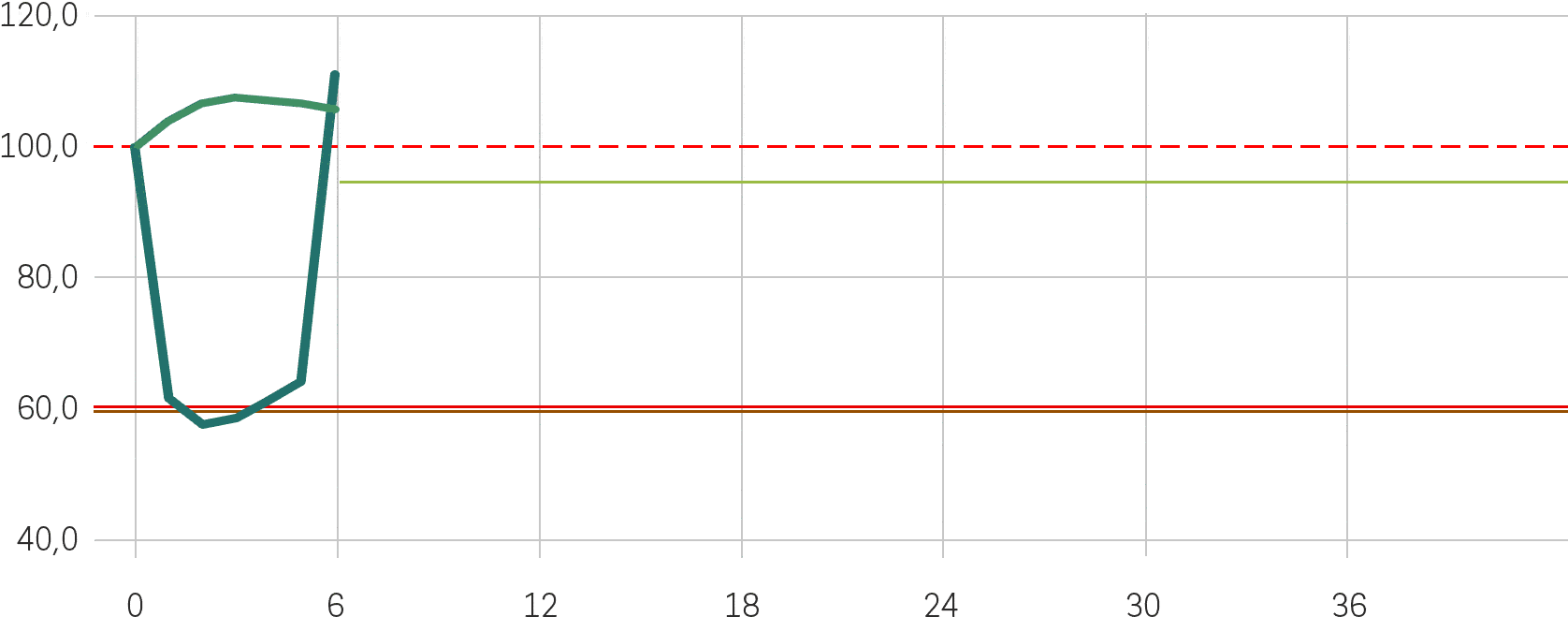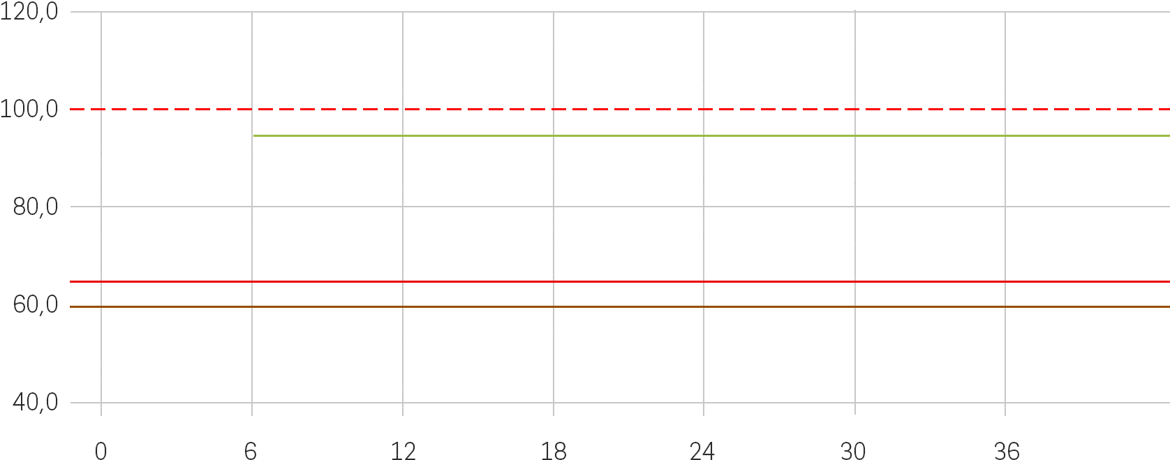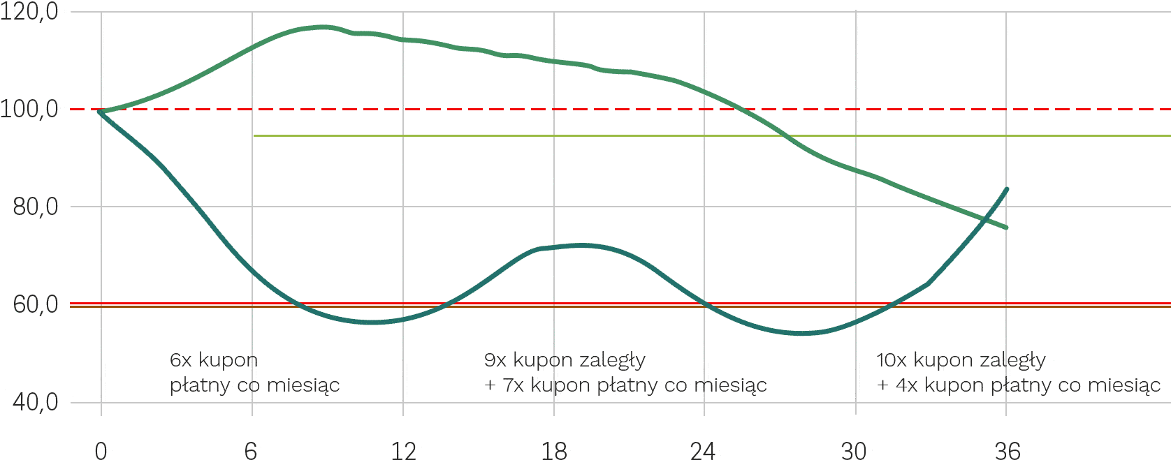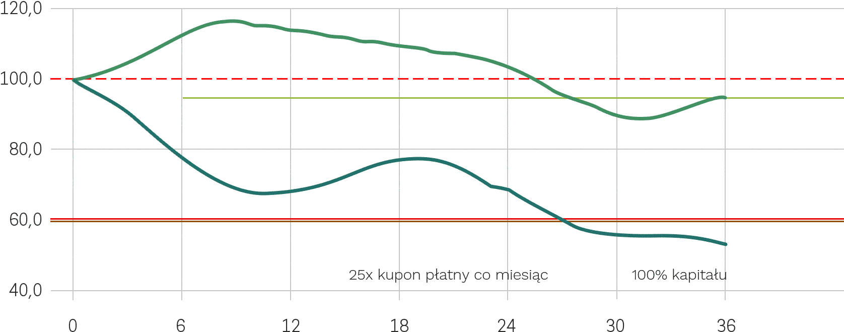 - każdej ze Spółek znajdą się na poziomie 60% Poziomu Początkowego lub powyżej tego poziomu – Inwestor otrzymuje Kupon w wysokości 0,5% oraz wszystkie Kupony, które nie zostały wcześniej wypłacone oraz zwrot wartości nominalnej;