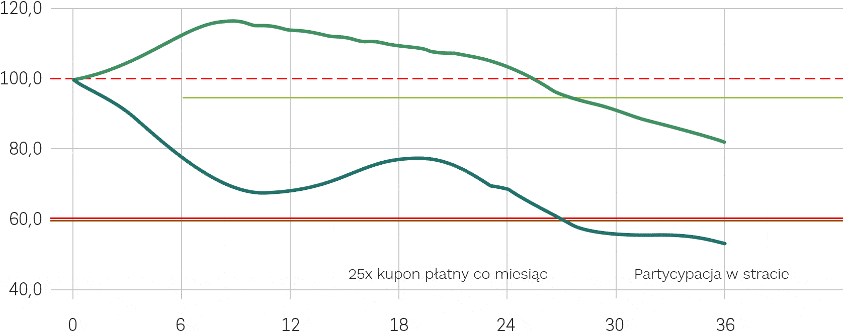 - zaistnienia spadku wartości akcji którejkolwiek ze Spółek w Dniu Wyceny Wykupu poniżej 60% ich wartości z Dnia Obserwacji Początkowej, a jednocześnie spadku drugiej ze Spółek poniżej 86% Poziomu Początkowego - w takim przypadku Inwestor ponosi stratę w wysokości procentowego spadku notowań akcji Spółki, która poniosła większą stratę (w skrajnej sytuacji Inwestor może stracić cały zainwestowany kapitał).