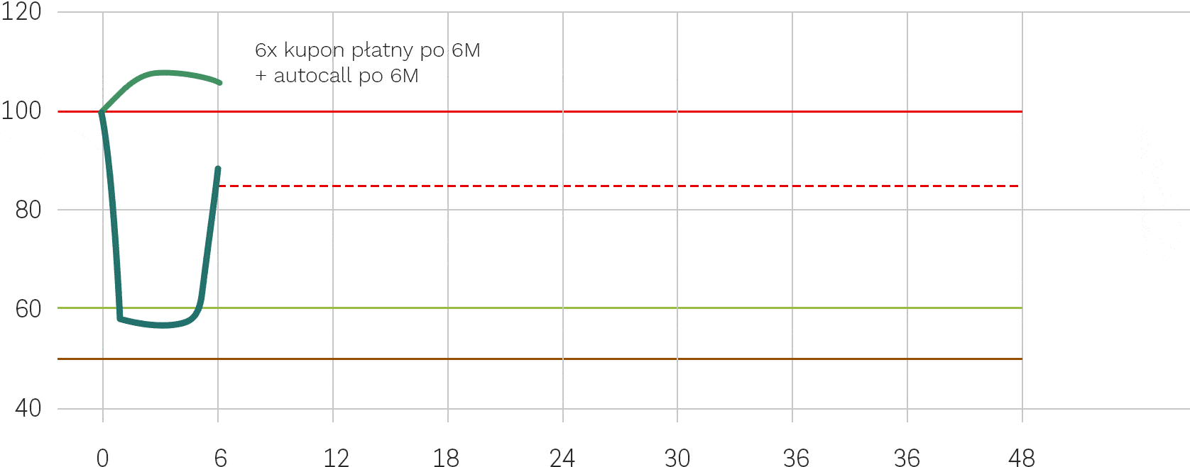 W przeciwnym razie, jeśli w danym Dniu Obserwacji notowanie akcji którejkolwiek ze Spółek znajdzie się poniżej Poziomu Bariery Wypłaty Kuponu, Kupon w tej obserwacji nie jest wypłacany, przy czym jeżeli w kolejnej obserwacji spełnione zostaną warunki wypłaty Kuponu, to będzie on wypłacony za wszystkie te okresy, w których nie był wcześniej wypłacony (efekt „śnieżnej kuli”). Należy pamiętać, że po automatycznym przedterminowym wykupieniu Certyfikatów żaden kolejny Kupon nie zostanie już wypłacony.