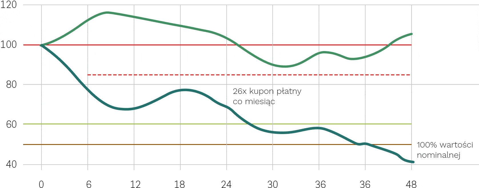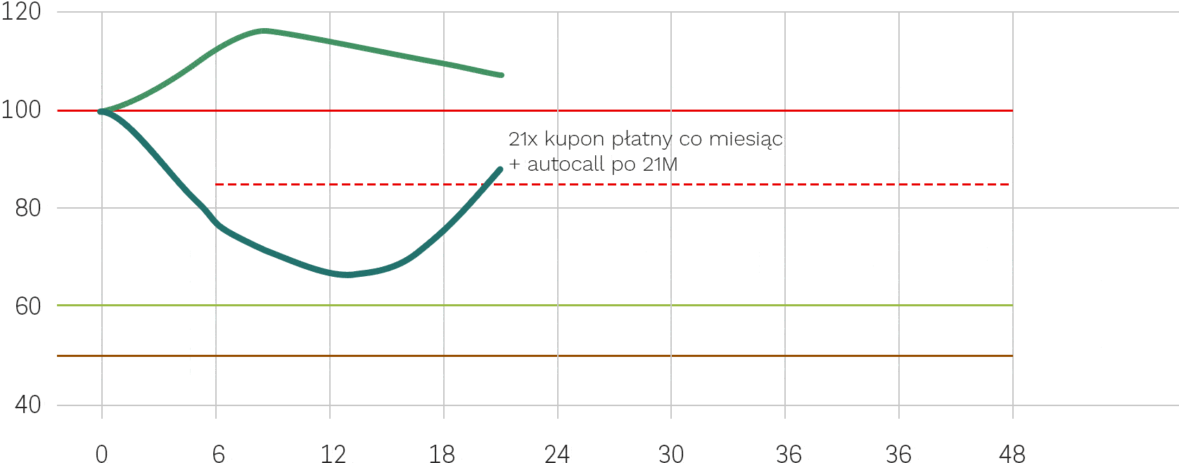 - którejkolwiek ze Spółek znajdą się poniżej 60% Poziomu Początkowego – Inwestor nie otrzymuje Kuponu.