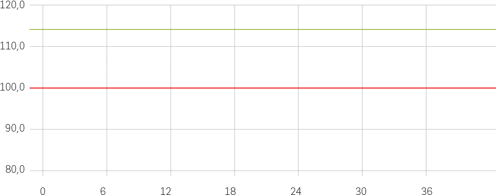1. powyżej Poziomu Początkowego, ale nie wyżej niż 114% wartości Poziomu Początkowego – Inwestorom wypłacone zostanie 100% wartości nominalnej Certyfikatu, powiększone o stopę zwrotu liczoną, jako różnica pomiędzy Poziomem Zamknięcia a Poziomem Początkowym (Inwestor ma udział/partycypuje w 100% we wzroście Surowca);
