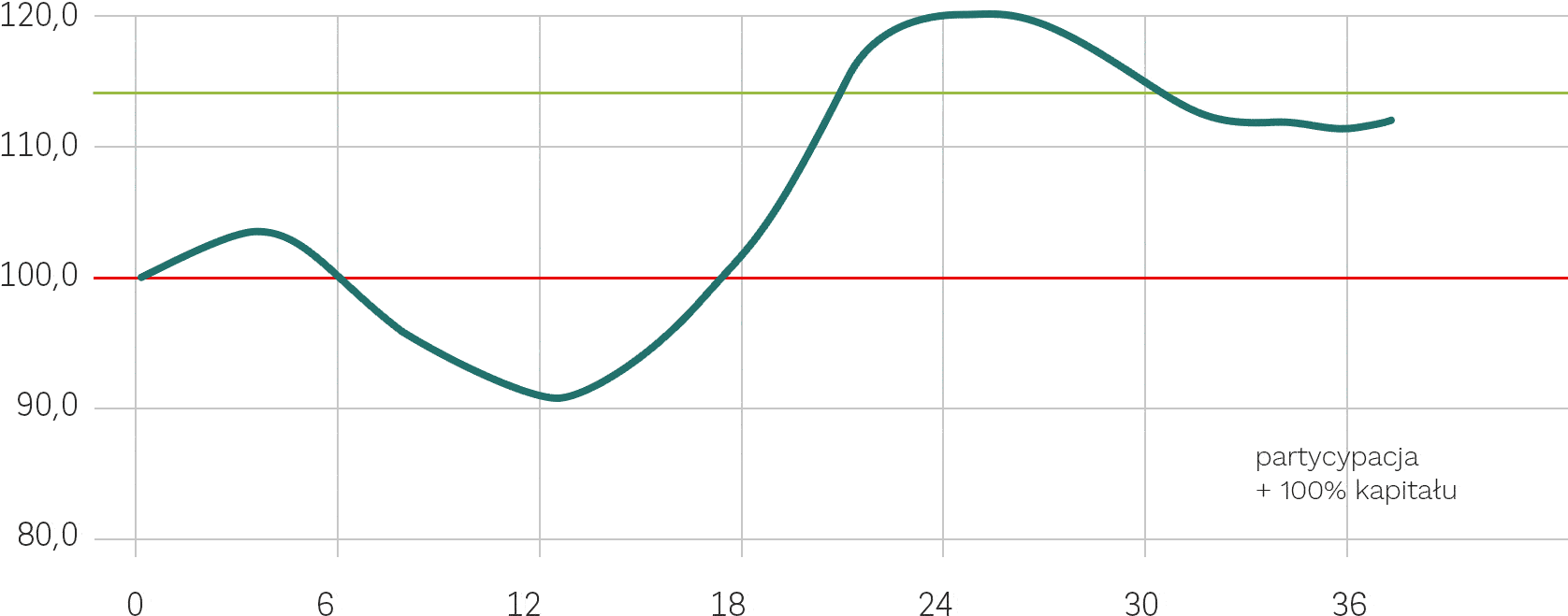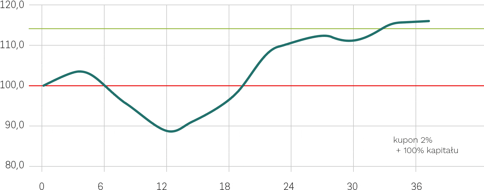 2. powyżej 114% wartości Poziomu Początkowego – Inwestorom zostanie wypłacone 100% wartości nominalnej Certyfikatu oraz Kupon Warunkowy w wysokości 2%;