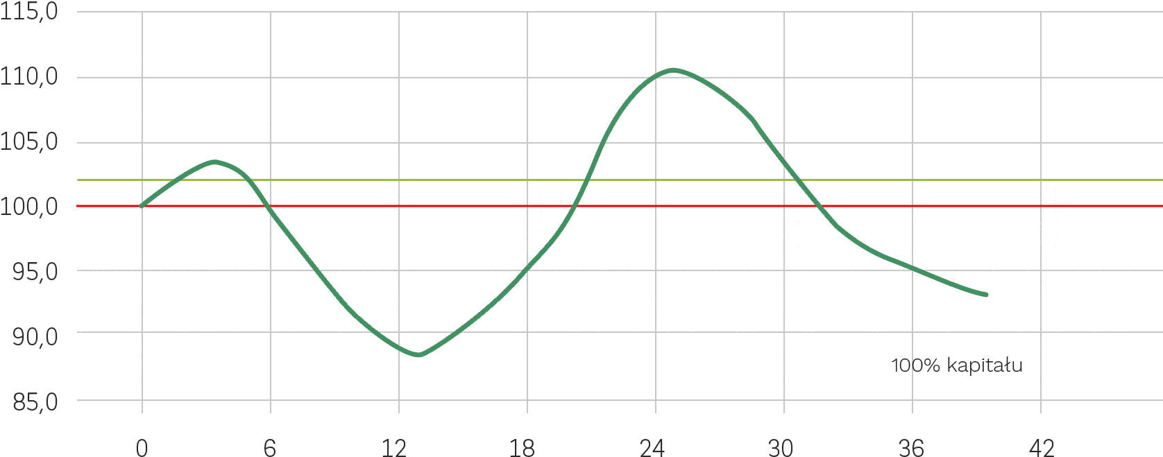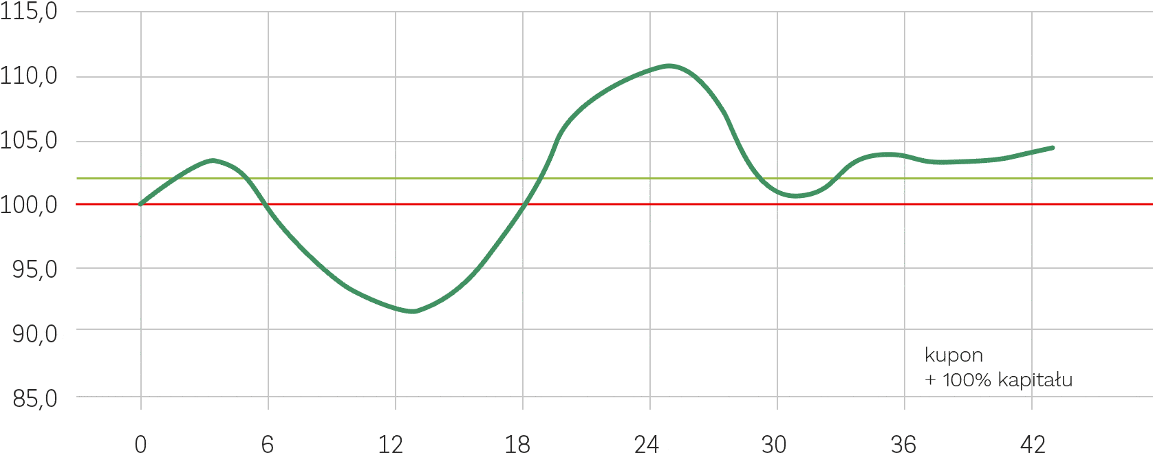 na albo poniżej 102% wartości Poziomu Początkowego – Inwestorom zostanie wpłacone 100% wartości nominalnej Certyfikatu.