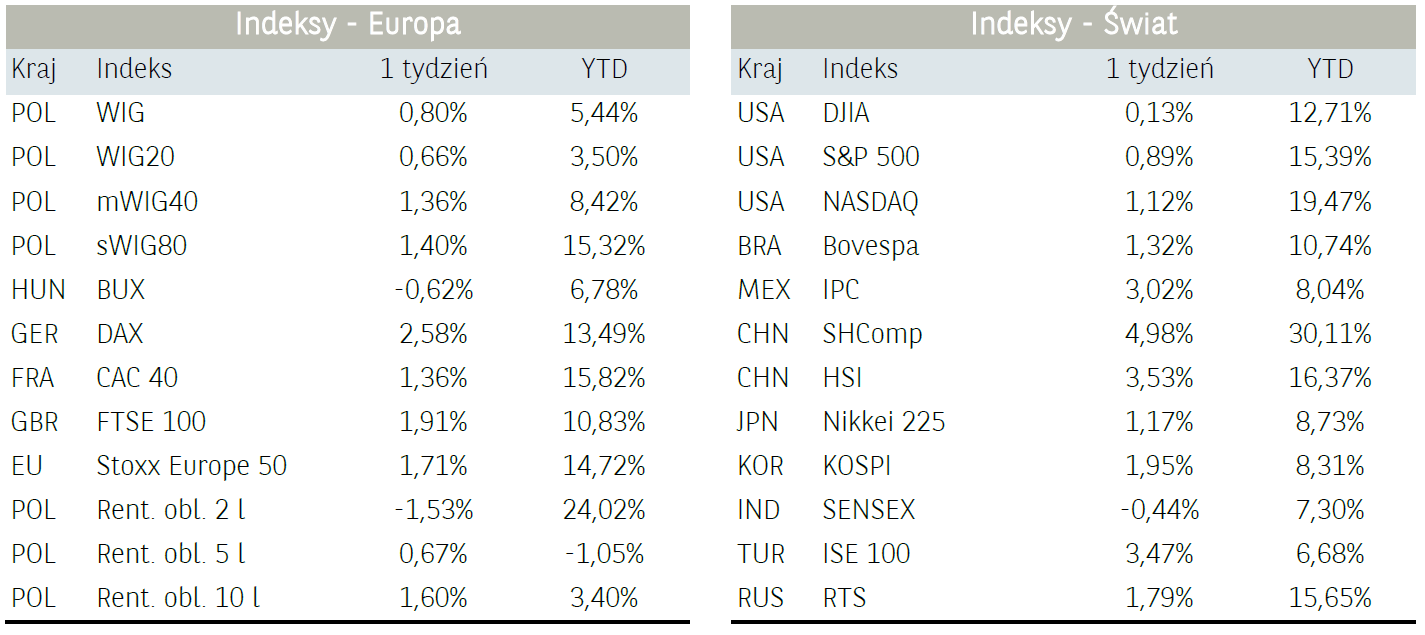 Ubiegły tydzień na rynkach finansowych przyniósł wzrost apetytu na ryzyko wśród inwestorów, co przełożyło się na zwyżki indeksów giełdowych zarówno rynków rozwiniętych jak i rozwijających się. Amerykański S&P 500 ma za sobą serię siedmiu sesji wzrostowych i znajduje się już jedynie 1,65% poniżej historycznego maksimum. Niemiecki DAX30 w ubiegłym tygodniu zyskał aż 4,2% docierając do psychologicznego oporu na poziomie 12 000 pkt. Katalizatorem wzrostów był odczyt indeksu PMI dla chińskiego sektora przemysłowego, który wzrósł z poziomu 49,2 pkt. do 50,5 pkt w marcu. Oznacza to, że po trzech miesiącach spadku aktywności w sektorze, obecnie w chińskiej gospodarce obserwujemy odbicie, co od początku bieżącego roku wyceniali inwestorzy. Wskazywały na to m.in. dynamiczne wzrosty chińskiego indeksu Shanghai Composite, który w tym roku zyskał już ponad 30%. Bardziej pozytywne perspektywy chińskiej gospodarki mają bezpośredni wpływ na postrzeganie globalnego wzrostu gospodarczego przez inwestorów, a co za tym idzie także na wycenę indeksów giełdowych. Pozytywny sentyment był