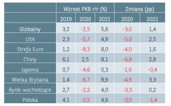 W naszej aktualizacji prognoz bierzemy także pod uwagę nowe informacje odnośnie działań stymulacyjnych ze strony banków centralnych oraz polityki fiskalnej. Skala, jak i szerokość podjętych akcji przez instytucje publiczne są bezprecedensowe, co powinno wesprzeć firmy i konsumentów w najtrudniejszych chwilach. Bierzemy również pod uwagę ostatnie dane dotyczące bezrobocia, które zaczęło w marcu rosnąć (szczególnie w Stanach Zjednoczonych, ale także w krajach strefy euro), co pokazuje jak trudnym zadaniem jest podtrzymanie aktywności gospodarczej w obliczu nałożonych restrykcji. Jest to drugi powód, poza wydłużeniem okresu lockdown, dla którego konsumenci oraz firmy ograniczać będą swoje wydatki przez co powrót do obserwowanych przed epidemią poziomów koniunktury potrwa co najmniej kilka kwartałów.