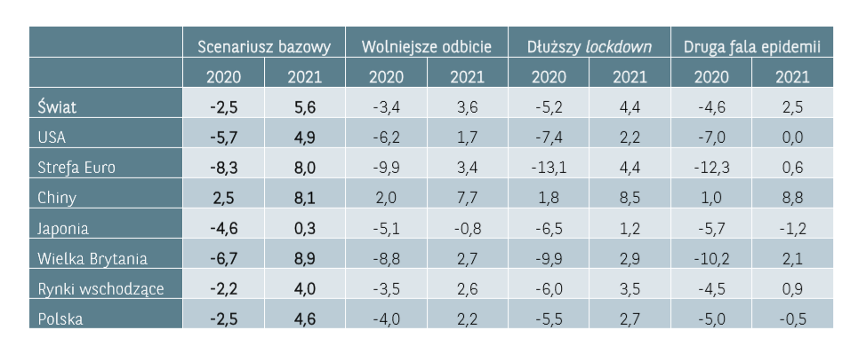 - Ponowne zatrzymanie gospodarek pod koniec br. skutkuje przerwaniem trwającego odbicia koniunktury co prowadzi do ponownego pogorszenia się nastrojów konsumentów i przedsiębiorstw. W tym scenariuszu zakładamy także wysoki wzrost zachorowań na COVID-19 na półkuli południowej (w trakcie ich zimy) oraz w krajach najmniej rozwiniętych, dysponującymi mniej efektywną infrastrukturą ochrony zdrowia.
