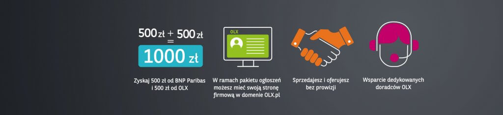Bank BNP Paribas dołącza do wsparcia przedsiębiorców w ramach rozpoczętej w kwietniu tego roku akcji „OLX 500 na start” i jako partner strategiczny projektu dofinansuje dodatkową kwotą 500 zł przedsiębiorców na największej w kraju platformie ogłoszeniowej. Dzięki wsparciu firm, które do tej pory nie ogłaszały się online, będą miały do wykorzystania na ten cel aż 1000 zł. Bank ufundował aż 1000 takich pakietów!
