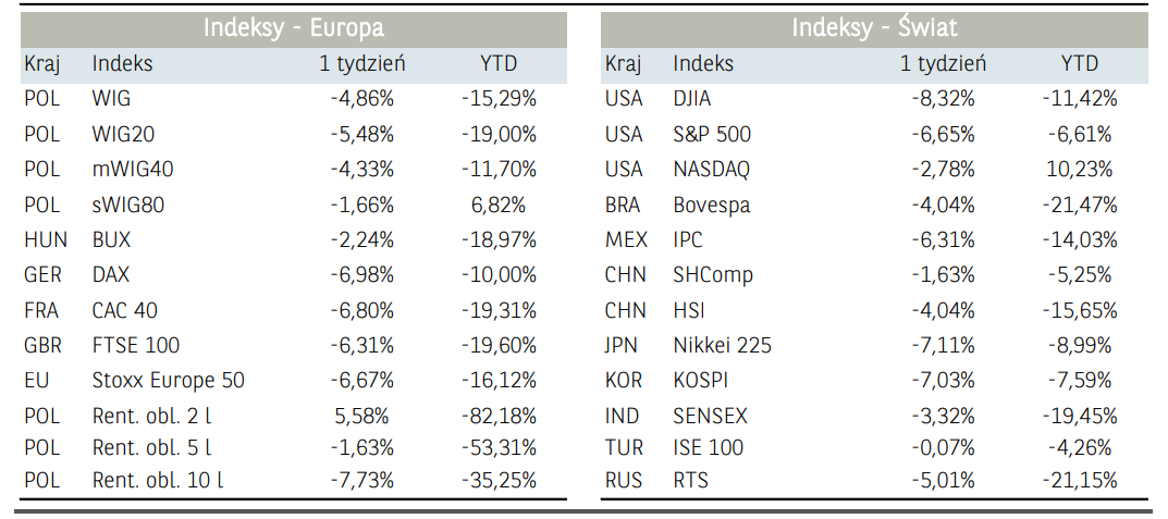 Ostatecznie w wyniku wydarzeń z drugiej części tygodnia szeroki indeks WIG stracił 2,57%, przy relatywnej sile sWIG80 (-1,28%) i słabości WIG20 (-2,91%). Zwiększona aktywność na parkietach przełożyła się na spadki rentowności obligacji skarbowych. Rentowności amerykańskich, niemieckich jak i polskich obligacji dziesięcioletnich spadały, lecz ostatecznie mieszczą się w obrębie konsolidacji z ostatnich tygodni. Z drugiej strony na fali wzrostu awersji do ryzyka zyskiwało złoto (+2,95%).