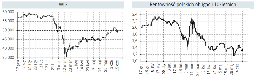 • Po spokojnej pierwszej części tygodnia, w czwartek zagraniczne indeksy akcji odnotowały największą sesyjną stratę od połowy marca. Wsparciem dla podaży były nieco słabsze dane z amerykańskiego rynku pracy, gdzie w ciągu raportowanego tygodnia liczba nowych wniosków o zasiłek dla bezrobotnych wyniosła 1,5 mln osób. Dodatkowo w Stanach Zjednoczonych w wybranych regionach odnotowano istotny wzrost nowych zachorowań na COVID-19, tym samym wzrosły rynkowe obawy o drugą falę pandemii lub ewentualne wolniejsze znoszenie ograniczeń.