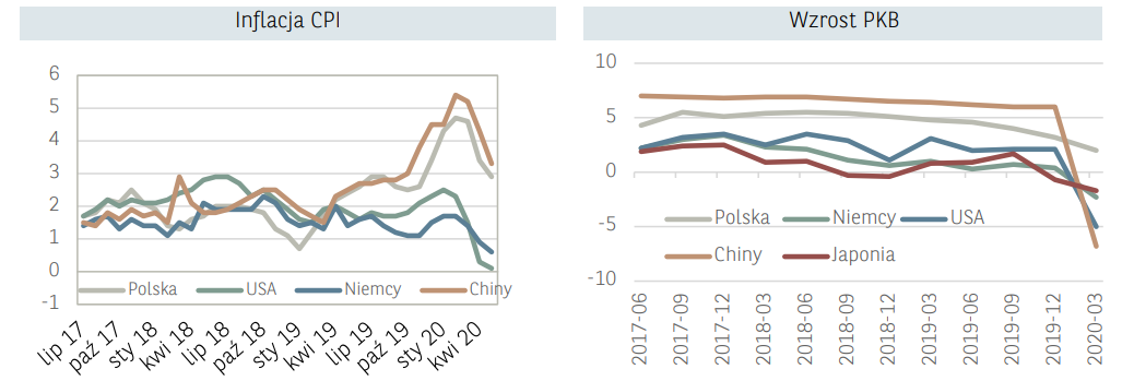Wśród pozostałych danych zwracamy uwagę na odczyty inflacji – w USA była ona poniżej prognoz i wzrosła o 0,1% r/r (+0,2% r/r konsensus i +0,3% w kwietniu). Z podobną tendencją mieliśmy do czynienia w Chinach, gdzie ceny konsumenckie były o 2,4% r/r wyższe przy oczekiwaniach +2,6% i +3,3% w kwietniu. Poza danymi o cenach z ciekawszych informacji warto wspomnieć o produkcji przemysłowej w Niemczech i Wielkiej Brytanii, przy czym odczyty dotyczyły jeszcze kwietnia, co przy obecnych warunkach rynkowych jest już dość odległą historią. W przypadku naszego zachodniego sąsiada produkcja spadła o 25,3% r/r, a w przypadku Wielkiej Brytanii o 24,4% r/r.