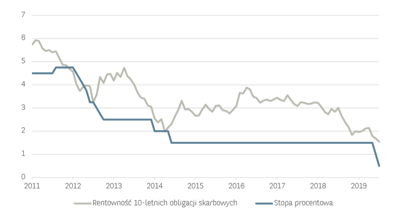 W przypadku indeksu WIG negatywny wpływ obniżek stóp na wyniki banków może być równoważony wsparciem koniunktury ze strony niższych stóp procentowych. Zwracamy przy tym uwagę, iż pozycja kapitałowa krajowych banków jest bardzo wysoka i obecny kryzys, choć wpłynie negatywnie na wyniki finansowe 2020 r., nie stanowi zagrożenia dla wypłacalności sektora. Ponadto coraz niższe stopy zwrotu oferowane przez rynek obligacji mogą wpływać w dłuższym terminie na zwiększenie napływów w kierunku rynku akcji. W przypadku rynku obligacji skarbowych spodziewamy się konsolidacji rentowności blisko historycznych minimów (1,5% dla obligacji 10-letnich). Uważamy, że w chwili obecnej dla rynku obligacji skarbowych czynniki pozytywne (oczekiwana niższa inflacja, wysoki popyt na bezpieczne aktywa) równoważą się z czynnikami ryzyka (spowalniająca koniunktura, wzrost wskaźników zadłużenia budżetu).