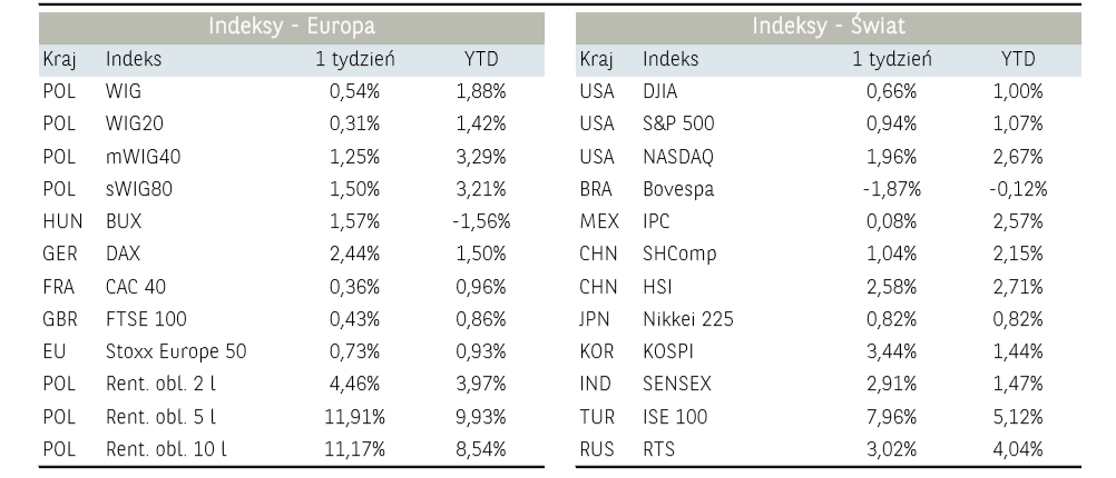 - W takim otoczeniu, skrócony o dzień, sesyjny tydzień na krajowym rynku przyniósł kosmetyczne wzrosty WIG-u na poziomie 0,22%. Relatywną słabość wykazały po raz kolejny największe podmioty notowane w ramach indeksu WIG20, który stracił 0,28%.