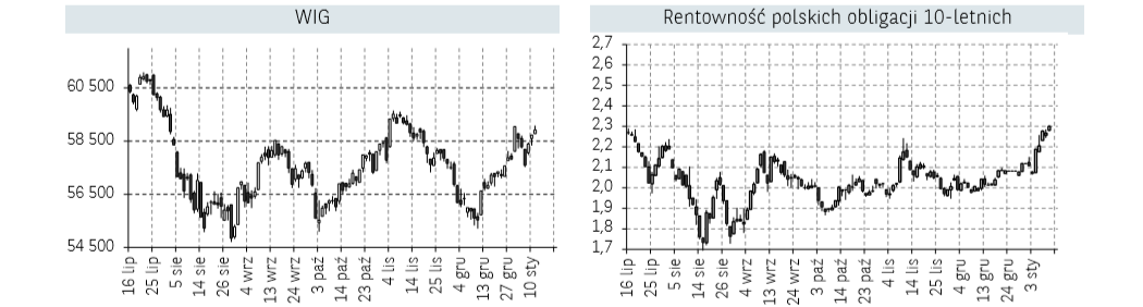 W Polsce wydarzeniem tygodnia było duże zaskoczenie na poziomie wzrostu inflacji CPI w grudniu, który wyniósł 3,4% r/r wobec oczekiwań na poziomie 2,9% r/r. Inflacja w grudniu napędzana była przez ceny żywności – o 7,0% r/r. Mocno wzrosła również prawdopodobnie inflacja bazowa, która według naszych szacunków wyniosła w ubiegłym miesiącu 3,1-3,2% wobec 2,6% w listopadzie. Dynamiczny wzrost CPI zbliżył wskaźnik do górnej granicy celu inflacyjnego NBP na poziomie 3,5%. Zapowiedziane na styczeń podwyżki cen prądu mogą w dalszym ciągu przyczynić się do wzrostu inflacji a w konsekwencji przekroczenia celu inflacyjnego. Pomimo powyższego, Rada Polityki Pieniężnej zdecydowała się na pozostawienie stóp procentowych na dotychczasowym poziomie, utrzymując swoje bieżące instrukcje, ucinając tym samym spekulacje o możliwych podwyżkach.