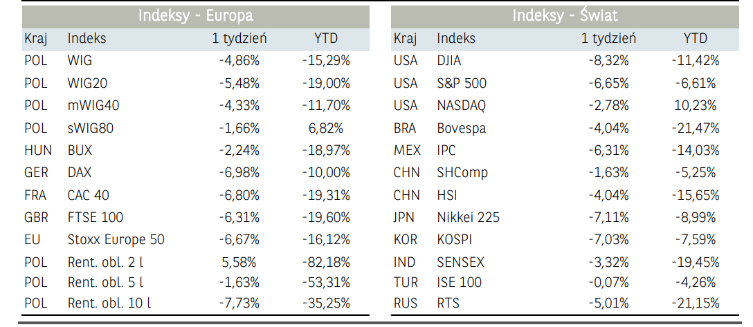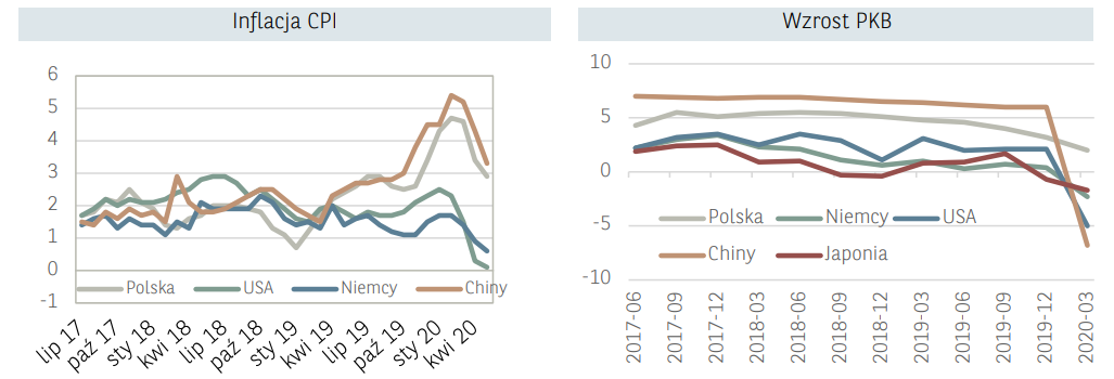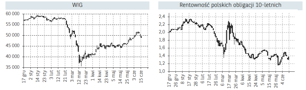 Początek ubiegłego tygodnia na rynkach akcji przebiegał pod znakiem kontynuacji wyprzedaży z poprzednich dni. Inwestorom ciążyły obawy odnośnie skali nowych zachorowań na świecie a w szczególności w Chinach oraz w wybranych stanach w USA, które zwiększają prawdopodobieństwo drugiej fali pandemii. Tryb tzw. risf off widoczny był również w przypływach kapitału, na wartości zyskiwały obligacje skarbowe natomiast traciły rynki rozwijające się oraz surowce przemysłowe. Nastroje inwestorów uległy jednak we wtorek gwałtownej zmianie, a popyt na ryzykowne aktywa utrzymywał się do końca tygodnia. Głównym wsparciem dla inwestorów giełdowych na całym świecie był komunikat Fed o włączeniu do programu stymulacji bezpośredniego zakupu obligacji korporacyjnych (poza zakupem jednostek funduszy ETF). Ponadto we wtorek dodatkowy impuls popytowy nadszedł ze strony danych na temat sprzedaży detalicznej w Stanach Zjednoczonych za maj. Konsensus rynkowy zakładał wzrost o 7,9% m/m, podczas gdy w rzeczywistości wyniósł on aż 17,7% m/m. W ostatnich tygodniach inwestorzy przyzwyczaili się do znaczących rozczarować względem odczytów makroekonomicznych, stąd tak silne pozytywne zaskoczenie przełożyło się na utrzymanie wysokiej aktywności strony popytowej. W rezultacie w trakcie sesji światowe indeksy zyskiwały tego dnia po ok. 1-3%. W środę i czwartek nastroje były nieco bardziej stonowane – inwestorzy oczekiwali m.in. na nowe informacje ze strony szczytu Rady Europejskiej. Głównym tematem spotkania były rozmowy o funduszu odbudowy będącym odpowiedzą na koronakryzys o wartości 750 mld EUR. Niestety, jak się okazało pod koniec tygodnia,