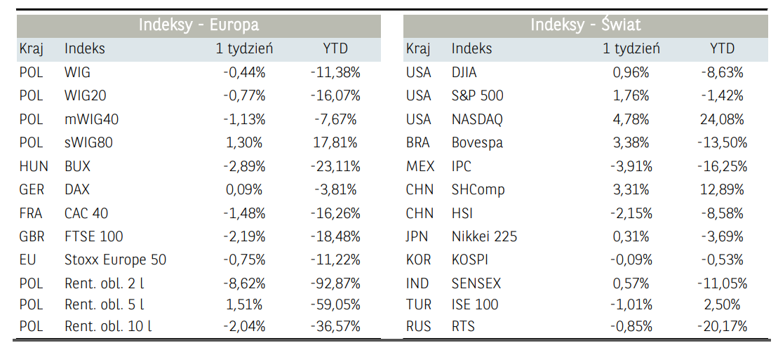korelacja pomiędzy zachowaniem się indeksów akcji, a wielkością bilansów banków centralnych. W tych warunkach relatywną siłę wykazały spółki technologiczne – indeks NASDAQ w skali tygodnia zyskał prawie 2%, bijąc kolejne historyczne rekordy notowań, a szczególnie pozytywnie wyróżniały się m.in. akcje Tesli (przekroczony poziom 1 500 USD) albo Netflixa. Na GPW indeksy zachowywały się podobnie jak rynki bazowe, to znaczy po mocnym poniedziałku obserwowaliśmy korektę w ciągu tygodnia i umiarkowane odbicie przed weekendem. Wśród komponentów WIG20 należy wyróżnić akcje KGHM, które zyskały ponad 10% na fali poprawy nastrojów względem chińskiej gospodarki. Na drugim biegunie znalazły się akcje CD Projekt (spadek ponad 6%), gdzie następuje realizacja zysków po wzrostach obserwowanych od marca.