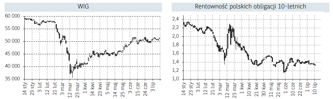 wzrostów z początku tygodnia. Spadki miały podstawy m.in. w publikacji najnowszych prognoz gospodarczych przez Komisję Europejską, która przyznała iż skutki izolacji są poważniejsze niż wcześniej tego oczekiwano. Przewaga negatywnych nastrojów wynikała także z mocnego wzrostu liczby chorych na COVID-19 w USA oraz wybranych państwach rozwijających się. Szczególnie obawy dotyczą Stanów Zjednoczonych, które notują rekordowe na świecie przyrosty zachorowań (ponad 60 tys. dziennie), co nasila obawy o powrót, przynajmniej miejscowych, lockdown-ów. Spadki na rynkach akcji mogą być także skorelowane z działaniami banków centralnych. Aktywa amerykańskiego Fed spadły 4 tydzień z rzędu i był to najmocniejszy tygodniowy spadek od ponad 11 lat, schodząc poniżej poziomu 7 bln USD. Również po raz pierwszy o 10 miesięcy banki nie zdecydowały się użyć żadnych środków z operacji repo (w porównaniu do 61,2 mld USD w zeszłym tygodniu). Chociaż w dłuższym terminie może świadczyć to o poprawie warunków rynkowych i braku konieczności dalszego wspierania płynności, to w krótkim terminie często występuje
